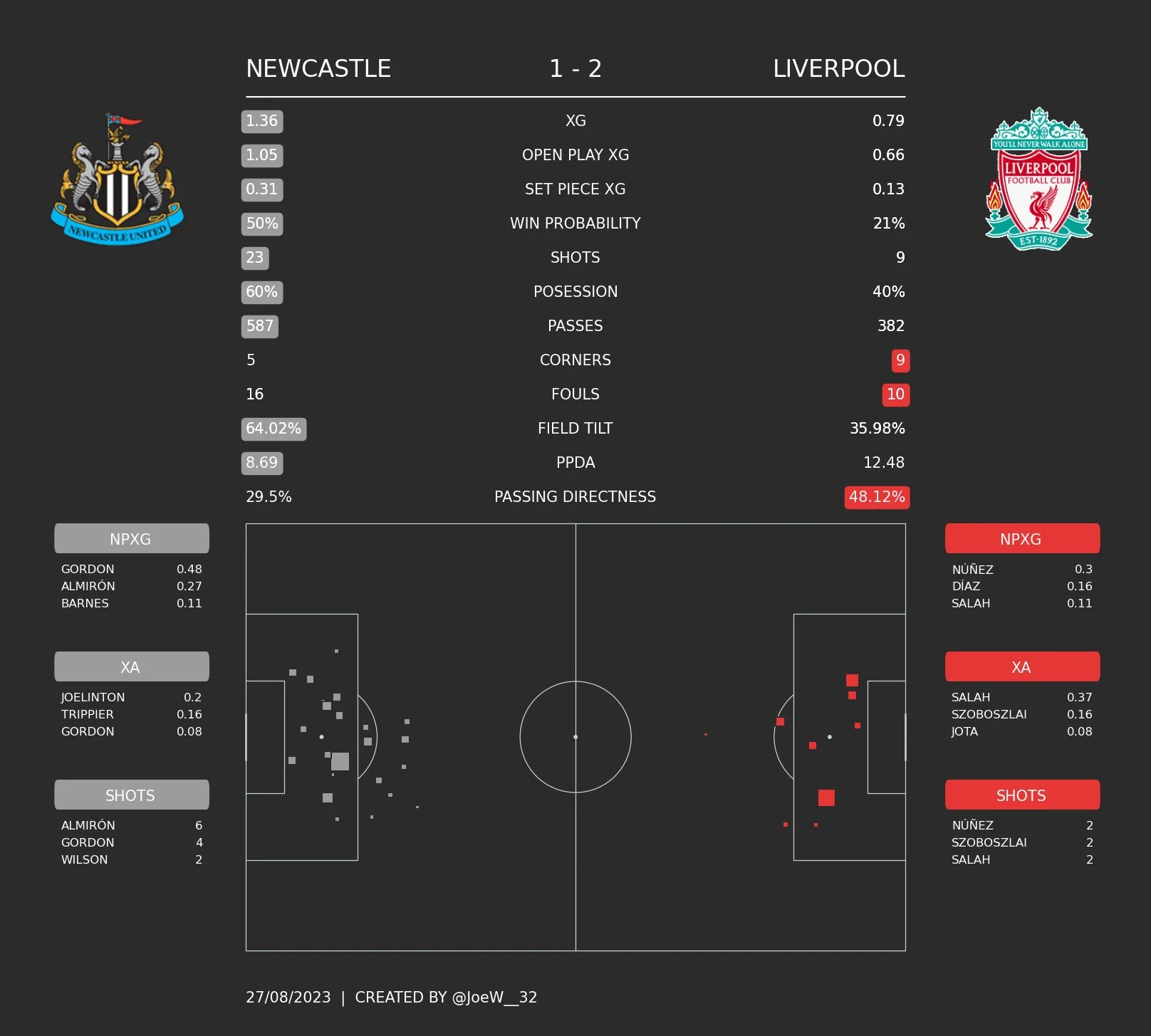 Джо Гомес замінив Діаса – одного з найгостріших у "червоних" за перші тури сезону. Трент ще й грудьми скинув під удар Альмірону, і лише казковий сейв Аліссона перевів м'яч у поперечину. Домінує Ньюкасл, а Гордон просто знущається своєю швидкістю з Трента. Дуже працьовиті Тоналі, Жоелінтон і Бруну Гімараєш дають змогу уникати пасток гостей у пресингу. Однак свої робочі конячки є і в гостей (Макалістер і Собослай імпонують рухом) , тож загалом саме рахунок 1:0 справедливіший, ніж будь-який інший. Якщо висунути за дужки регулярні помилки Александера-Арнольда, не помітно аж такої переваги команди, яка грає в більшості.
