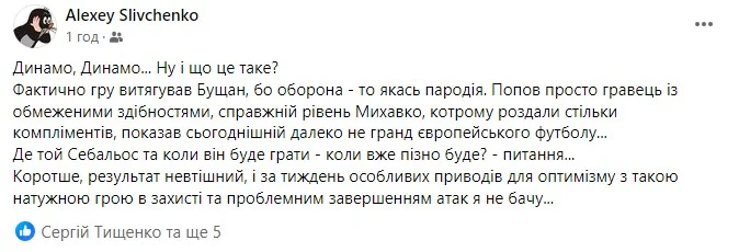 Журналіст Sport.ua Олексій Сливченко характеризує гру Тараса Михавка словом "жах" і емоційно скрикує: "Де той Себальйос?"