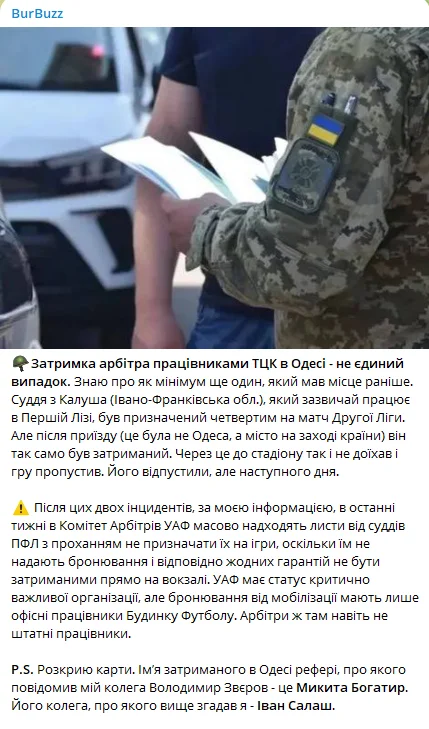 Журналіст Ігор Бурбас назвав ім'я арбітра, затриманого нещодавно співробітниками ТЦК в Одесі та розповів про інший подібний випадок.