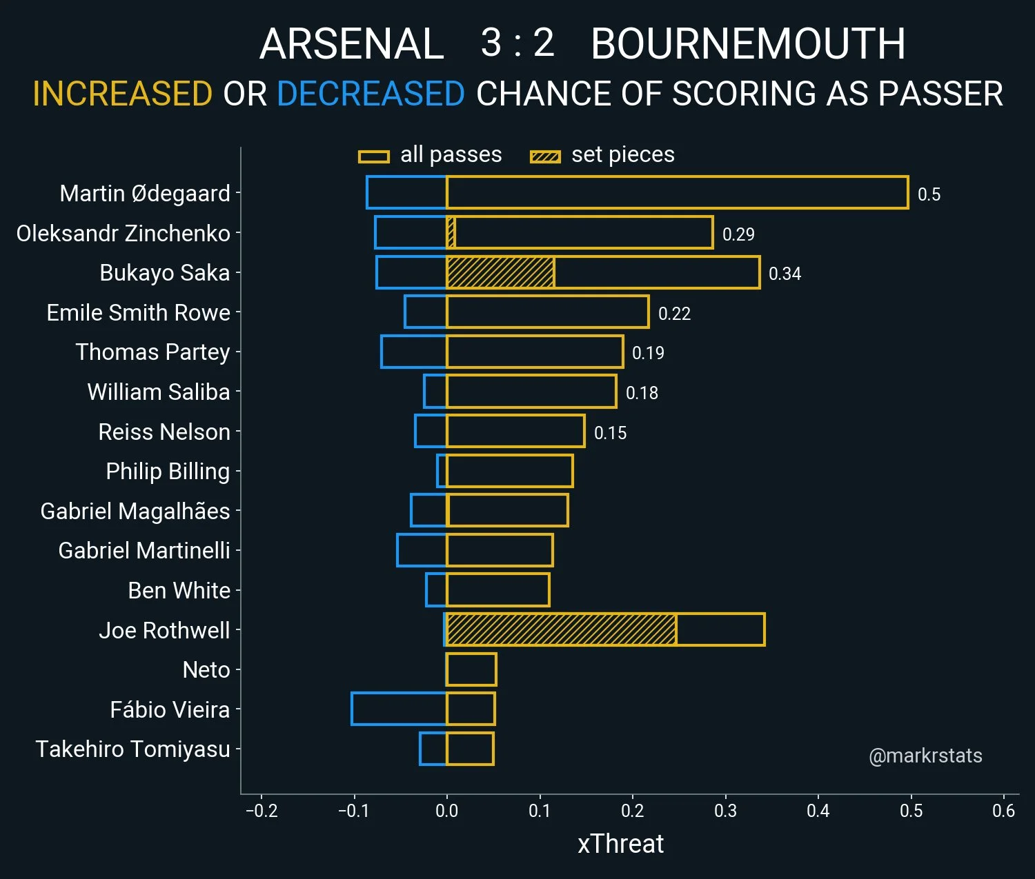 Вибухово почався поєдинок. Гості розіграли з центра поля і всією командою рванули у фінальну третину. Зінченко пасивно у відборі проти Уттара, Габріел пропускає під ногою пас на Біллінга, проти якого взагалі ніхто не грає – 0:1. Екс-голкіпер Барселони Нету тягне 3 поспіль удари. Едегор (двічі) та Сака пробивали. Особливо вражаючим був сейв після удару Букайо на добиванні з кількох метрів. Цей момент потягнув навіть на більший xG, ніж гол Біллінга.
