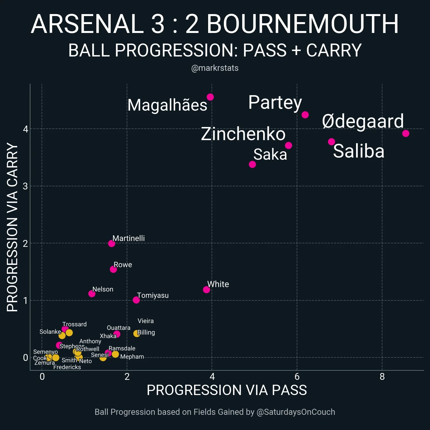 Після стартового штурму Арсенала передостання команда АПЛ дуже спокійно захищається. Ніби і заходять лондонці у чужий штрафний регулярно (35 торкань проти 3 дозволених суперникам), але там немає жодної переваги, постійно страхують гості один одного, закриваючи усі можливі зони, а безкінчені дальні удари Едегора – ні про що. Зінченко традиційно на висоті, хоч і не придумав чогось надзвичайного: створив єдиний момент на 0,18 очікуваного асисту, двічі пробивав у блок та успішно йшов у дриблінг, виграв усі 4 свої єдиноборства, віддав 9 передач у фінальну третину, лише тричі помилився при передачах і припустився 6 втрат.