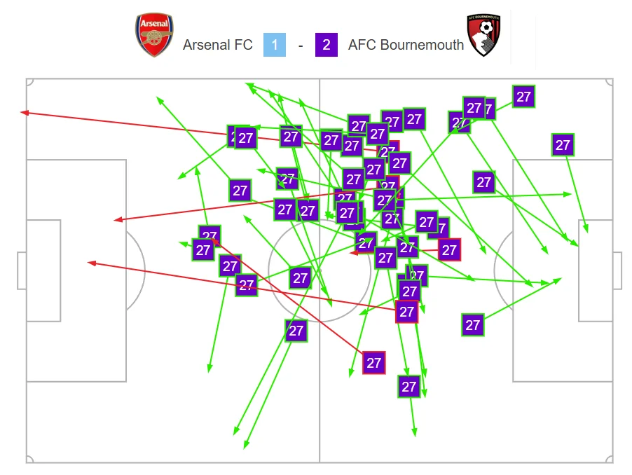 Матч з Борнмутом не став винятком. Лондонці провели 13 пострілів по воротах і 33 дотики в штрафному, що непогано. Втім, сумарна гострота ударів Арсенала склала невисокі 1,43 очікуваних голи, а після 55-ї хвилини моментів не виникало. Ба більше – половина xG припала на удар у порожні, який відкрив рахунок.