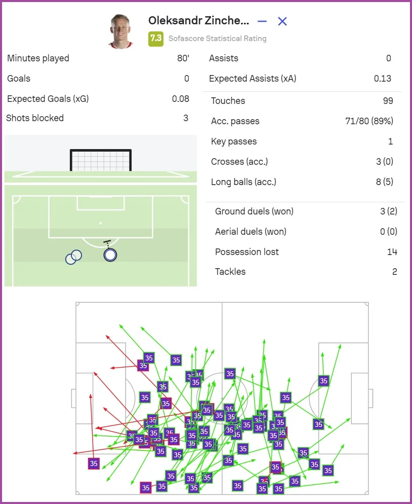 Олександр мав багато можливостей загострити гру та активно їх використовував. Він завдав трьох дальніх ударів, які потягнули на 0,08xG (всі були заблоковані, один – рукою Тарковскі). А ще Зінченко шукав варіанти для вертикальних передач через півфланг.