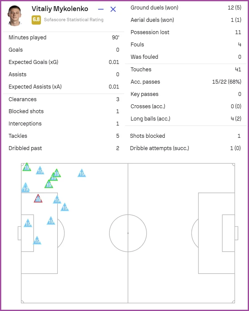 Оцінки статистичних порталів: SofaScore – 6.8, WhoScored – 6.7, FotMob – 6.5.