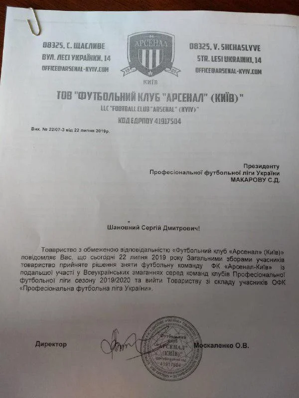 Як стало відомо Sport Arena, Арсенал-Київ не буде грати у Першій лізі в новому сезоні. Керівництво столичного клубу повідомило про це рішення президента ПФЛ Сергія Макарова в офіційній заяві.