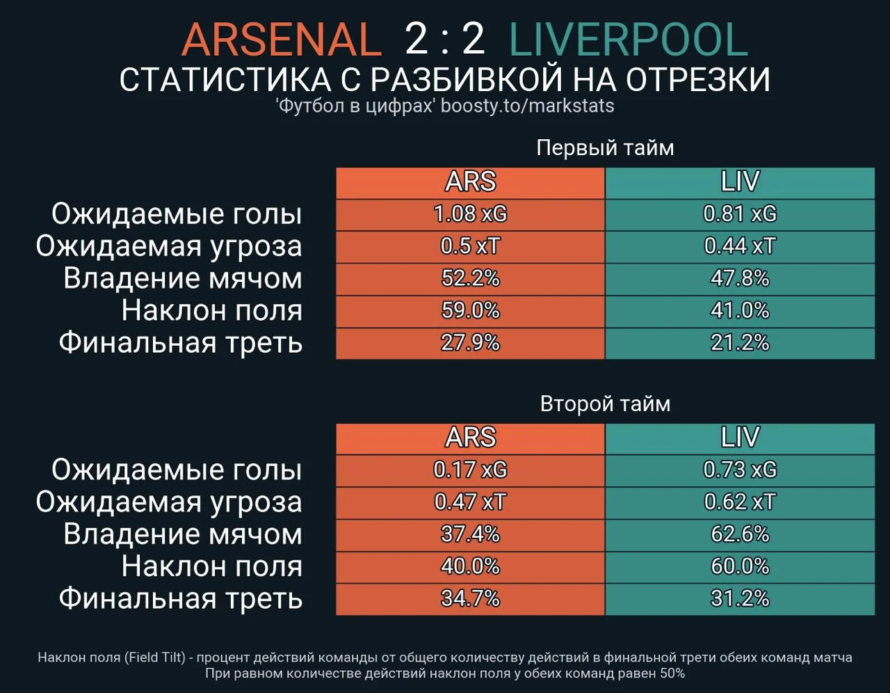 І все це спрацювало. У першому таймі "каноніри" переграли Ліверпуль за більшістю показників. Господарі володіли м'ячем 53% часу, провели вдвічі більше ударів (6 vs 3) й мали вдвічі вищий показник очікуваних голів (0,8 vs 0,36 xG). Лондонці опустили точність передач мерсисайдців до низьких 79%, вигравши єдиноборства на землі (19 vs 13) та в повітрі (9:7).