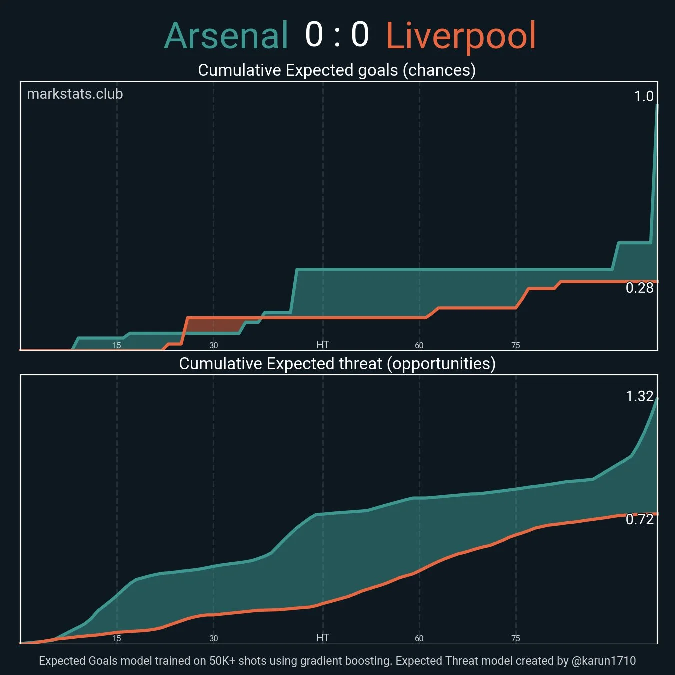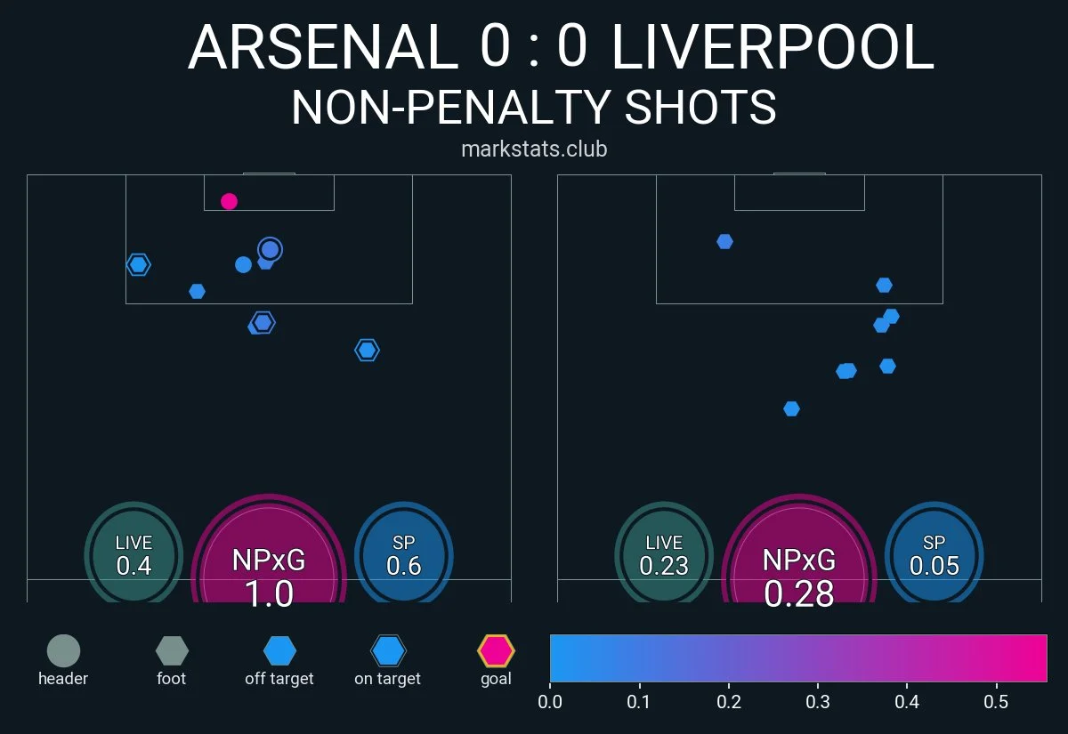 Статистика ударів за весь матч. Показово, наскільки мізерний показник гостроти ударів з гри мав Арсенал, хоча "каноніри" все одно виявились гострішими сумарно.