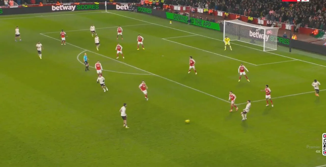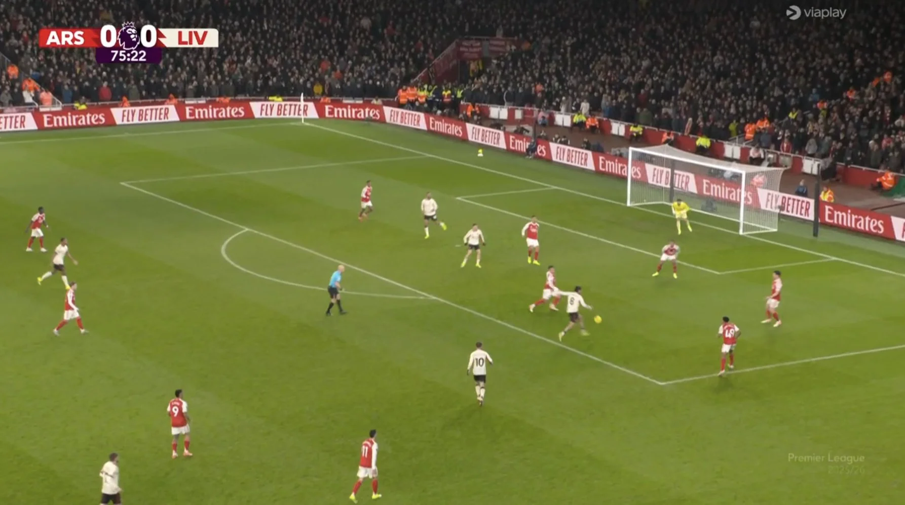 Також пригадується простріл Райса з лівого флангу вздовж лінії воротарського, який теж ніхто не замкнув. Взагалі, більшість кросів Арсенала залишились без гострого завершення. В кращому випадку вони призводили до атак другим темпом та до ударів під тиском з незручних позицій. Сака й Райс змогли влучити у площину, от тільки жодної небезпеки для Аліссона ці постріли не принесли.