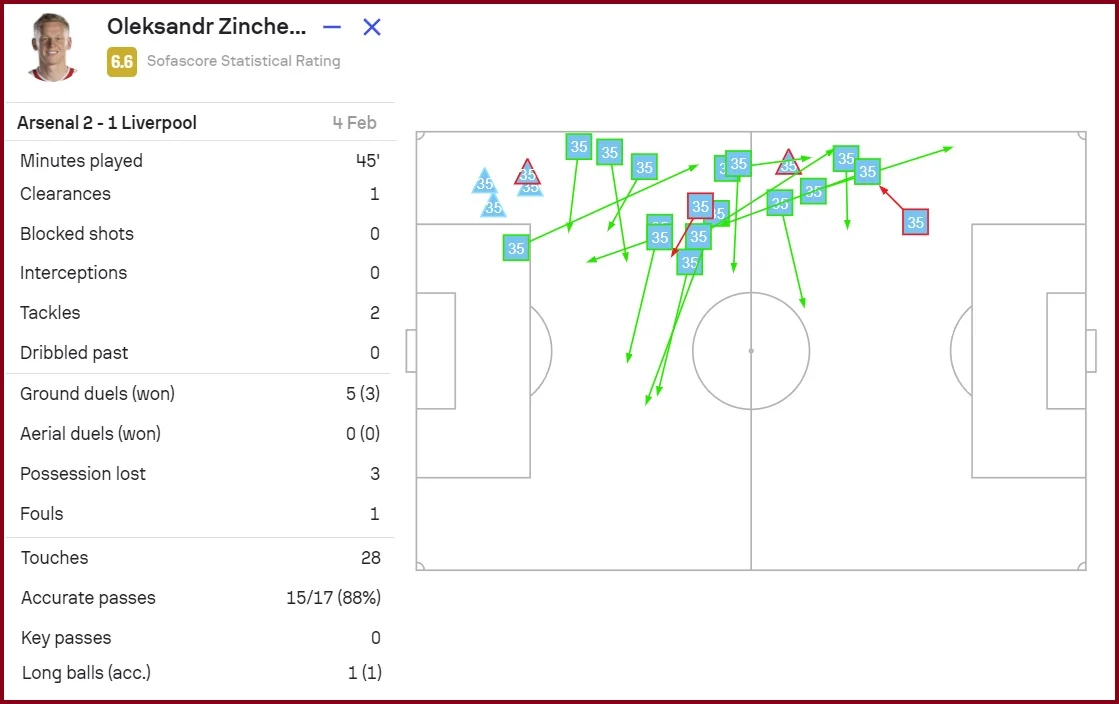 Мабуть, саме тому Артета вирішив замінити Олександра у перерві. Замість нього вийшов більш орієнтований на захист Ківіор. Оцінки статистичних порталів: SofaScore – 6.6, WhoScored – 6.3, FotMob – 6.5.