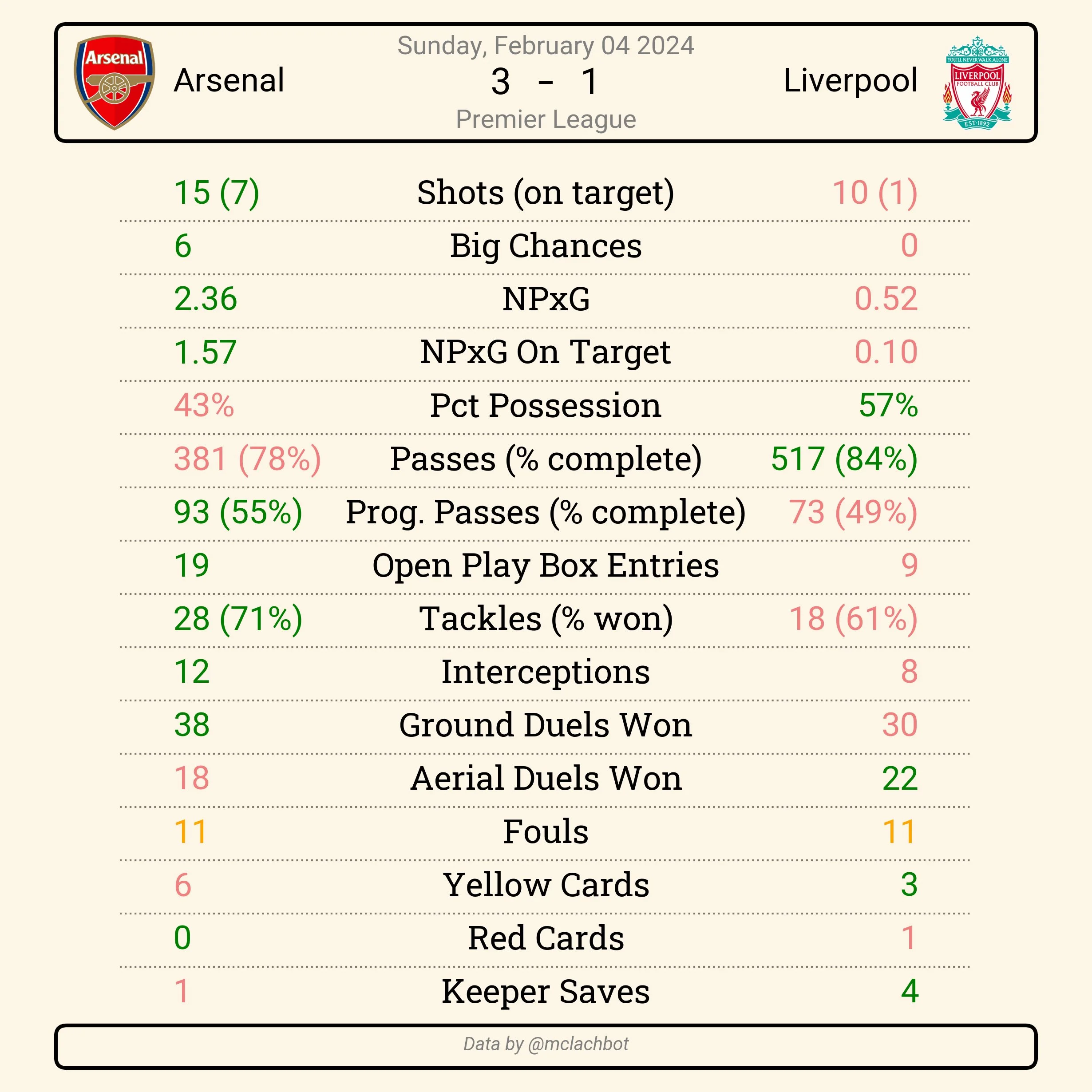 Ліверпуль же за весь перший тайм не створив абсолютно нічого (0,1xG). Лише 2 незаблоковані удари, лише 4 входи у штрафний. Але команда Юргена Клоппа звично отримала гол з нічого в компенсований час. Діас поборовся, чим спровокував непорозуміння між Саліба та Раєю. У підсумку м'яч від руки Габріела залетів у ворота.