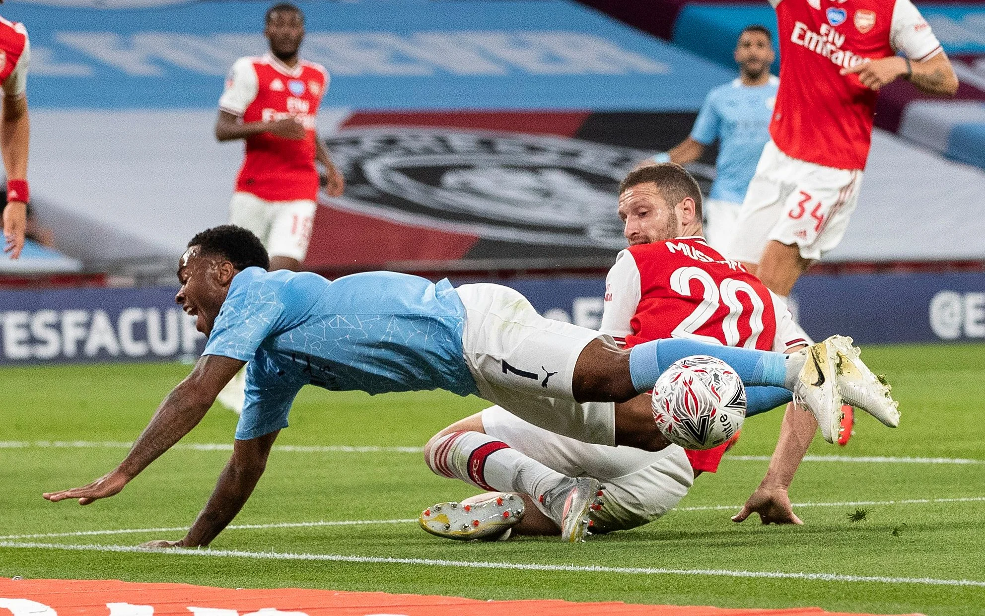 За кілька хвилин по цьому Мікель Артета випустив на поле Торрейру, і Арсенал став грати на утримання результату. Манчестер Сіті з цього часу хоч і тримав штрафний "канонірів" у облозі, але не притискав Арсенал – лондонці впевнено відбивалися, і навіть удар Стерлінга із семи метрів у Давіда Луїса не налякав. Реально страшно стало на 83-й хвилині, коли Ляпорт з лінії штрафного закрутив м'яч у правий верхній кут – сфера пролетіла поруч зі стійкою! Як виявилося, це був останній небезпечний момент у матчі, адже всі наступні хвилини з'їли дрібні паузи на заміни та лікування травм і судом.