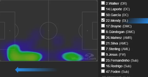 Доволі непросто оцінити Менді в матчі проти Арсенала. З одного боку, це був один з найактивніших футболістів у складі Манчестер Сіті – в його активі 96 дотиків до м'яча та 87 передач. Більше зробив тільки центрбек Аймерік Ляпорт. 35 пасів француза були спрямовані вертикально вперед, та і сам він просував м'яч на рівні Стерлінга, тричі обігравши суперника на дриблінгу в п'яти спробах – кожного разу прохід відбувався в районі лінії штрафного. Теплова карта Бенжамена прямо горить на чужій половині поля.
