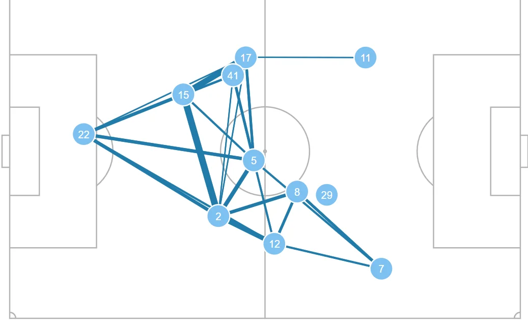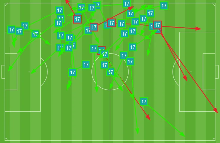 Помітно, як відірваний від комбінацій Хаверц (№29) і як мало підтримки для Сака (№7) та Едегора (№8) з боку Тімбера (№12) та Партея (№5). Тома й Мартін взагалі не пасувались, а у всіх інших варіантах зв'язку було не більше 3 передач один одному.