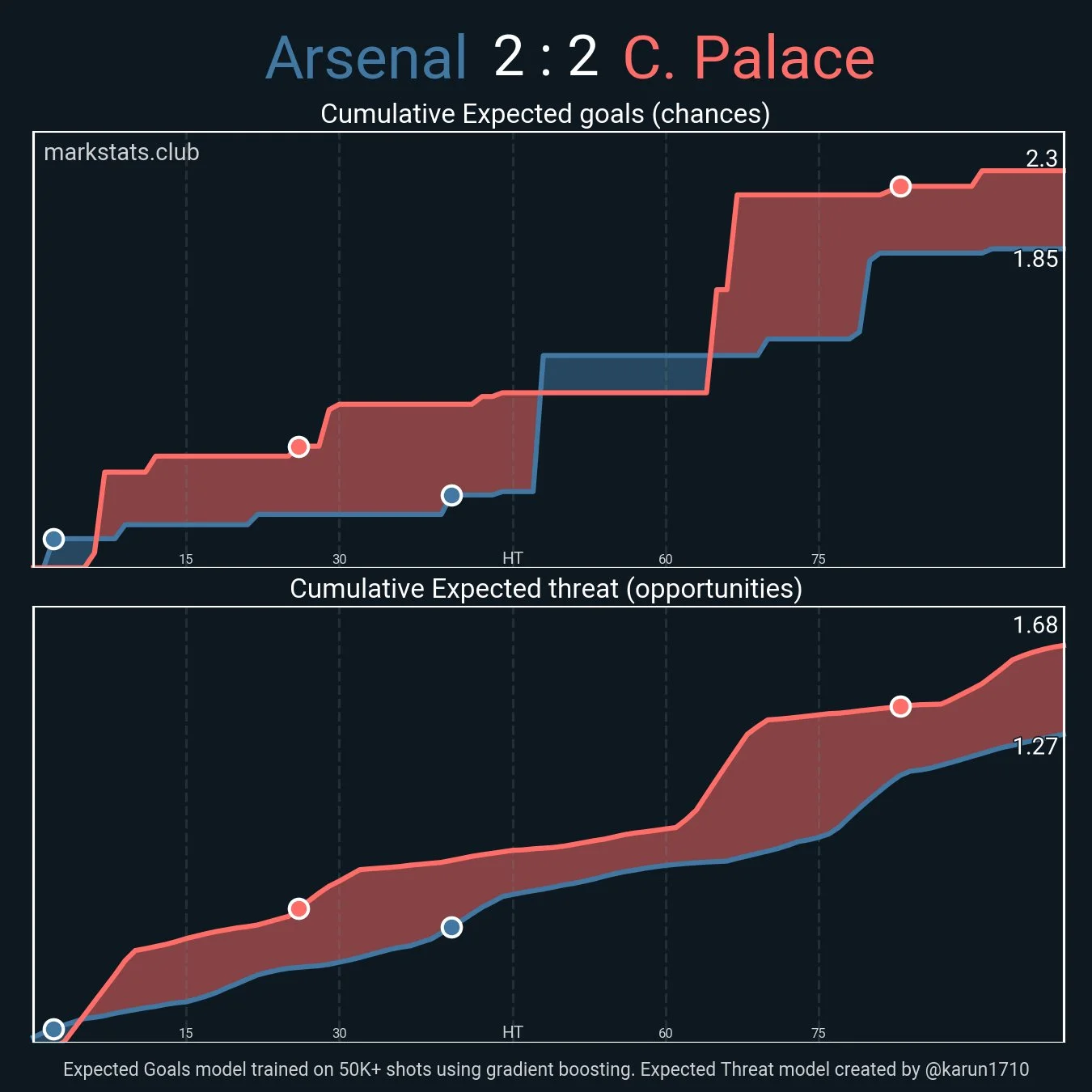 Втім, по ходу гри відчувалося, що "каноніри" перебувають десь на іншій планеті. Команда вже явно налаштувалась на приїзд парижан – підопічні Мікеля Артети берегли себе у єдиноборствах (провалили 36 дуелей з 54-х) і залишали забагато простору позаду. Крістал Пелас до самого кінця зберіг перевагу за кількістю дотиків у штрафному (25-23), за ударами (15-12), очікуваними голами та гостротою..