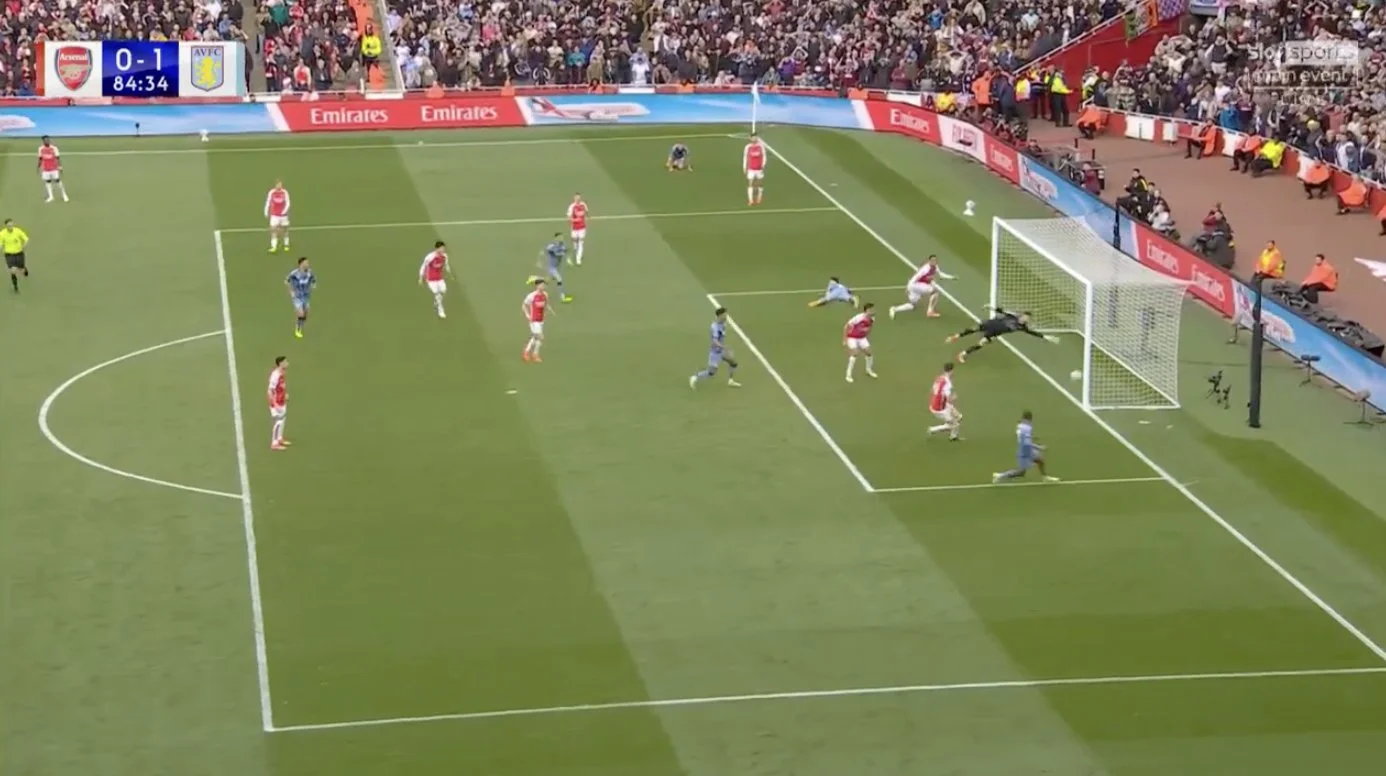 Катастрофа сталася пізніше.На 84-й хвилині Астон Вілла провалила кутовий, але виграла підбирання й провела атаку другим темпом. У її завершенні Дінь прострілив з лівого флангу, а м'яч проскочив повз трьох футболістів Арсенала у воротарському майданчику (не рахуючи голкіпера). Бейлі покарав за розконцентрацію, замкнувши на дальній стійці – 0:1!