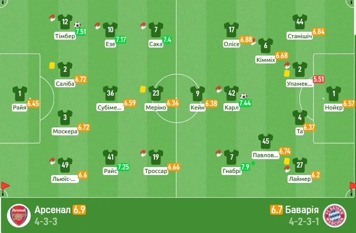 "Канонірам" бракувало агресії без м'яча на чужій третині, тож німці виходили з-під тиску – але все одно робили це довго й не без втрат. У позиційній атаці команди пробували розтягувати структуру суперника діагоналями та перевіряли глибину, однак захисники Арсенала й Баварії працювали вкрай уважно. Як наслідок, вболівальники побачили всього по три удари, однак у них вмістилися два голи й кілька моментів.