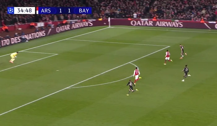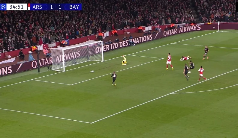 Господарі ж створювали момент за моментом. Забивати другий гол вони мали вже за дві хвилини по перерві, коли Кімміх перед власним штрафним вибив м'яч на Сака – Букайо спокійно зайшов на правий край і вгатив у ближню дев'ятку. Ноєр врятував "рекордмайстерів"!