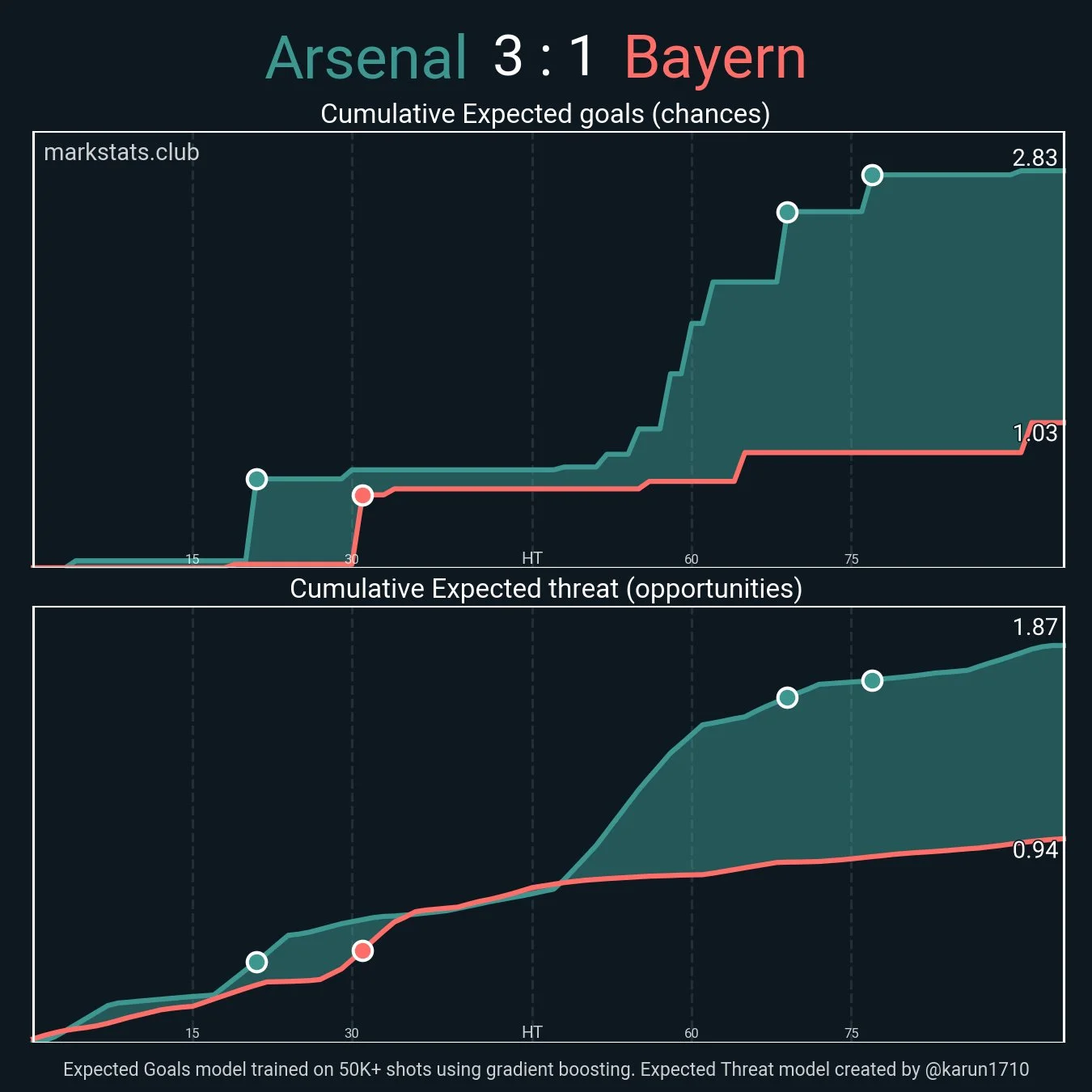 Якщо до перерви мюнхенці непогано контрили Арсенал, то в другому таймі їхня гра плавно розвалилася. Володіння впадло з 62% до 51%, а за весь другий тайм підопічні Венсана Компані провели всього два удари. Їхня сумарна гострота склала всього 0,15 xG.