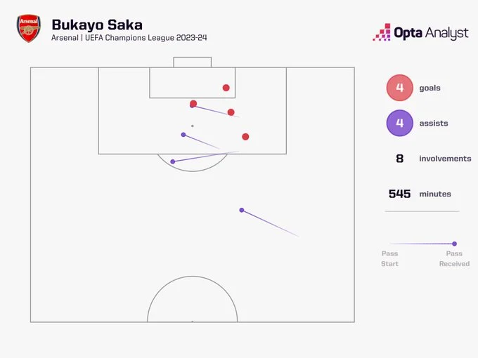 Таким чином, Букайо долучився до восьмого гола Арсенала у поточному сезоні Ліги чемпіонів (4 голи й 4 асисти). Більше результативних дій має тільки Кейн.