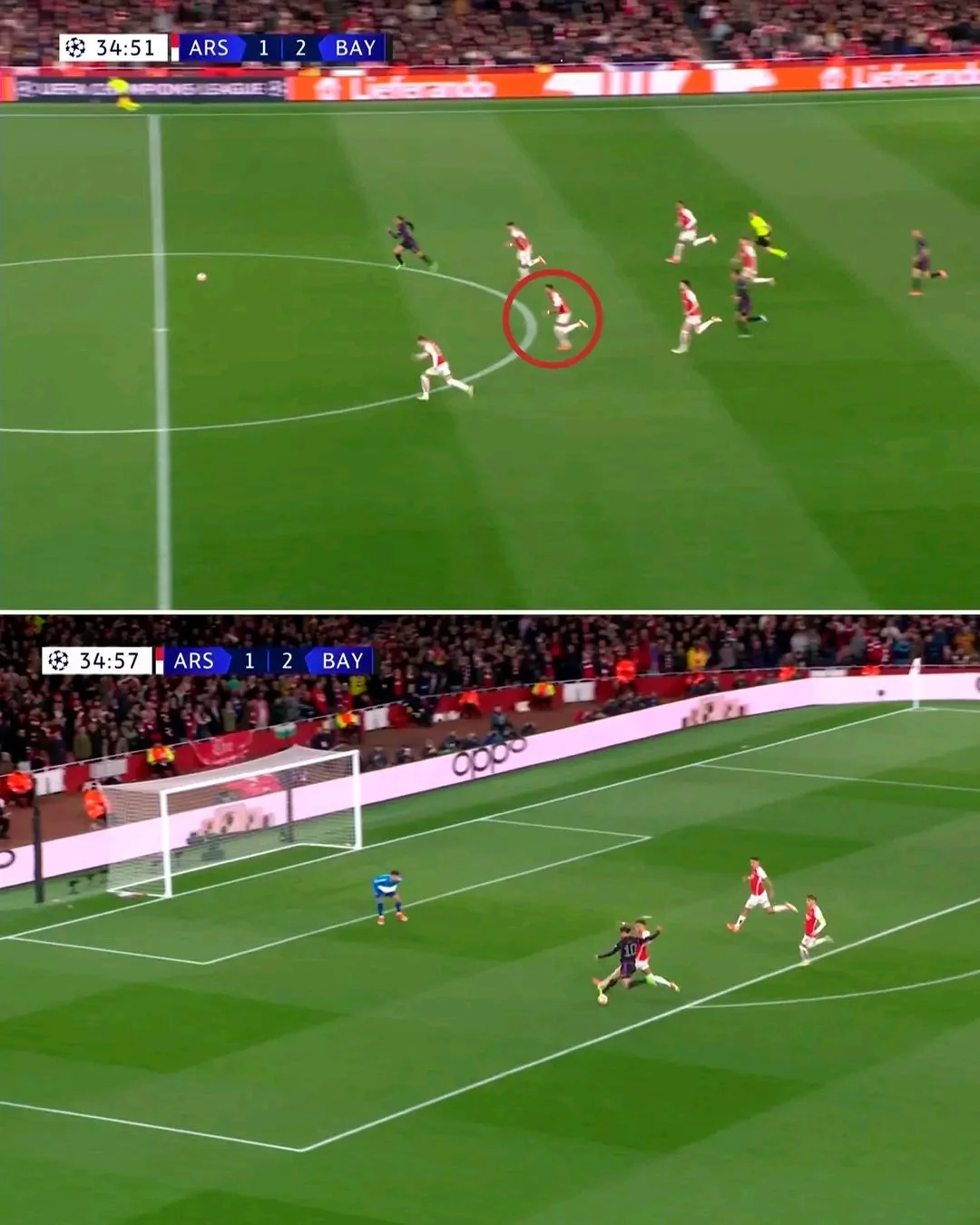 На 37-й хвилині все могло завершитись. Арсенал знову втягнувся й втратив м'яч, а Мусіала однією передачею запустив Сане на рандеву з голкіпером. Лерой пробіг метрів 40 із Вайтом на хвості, однак прямо перед ударом Бен встиг його накрити!