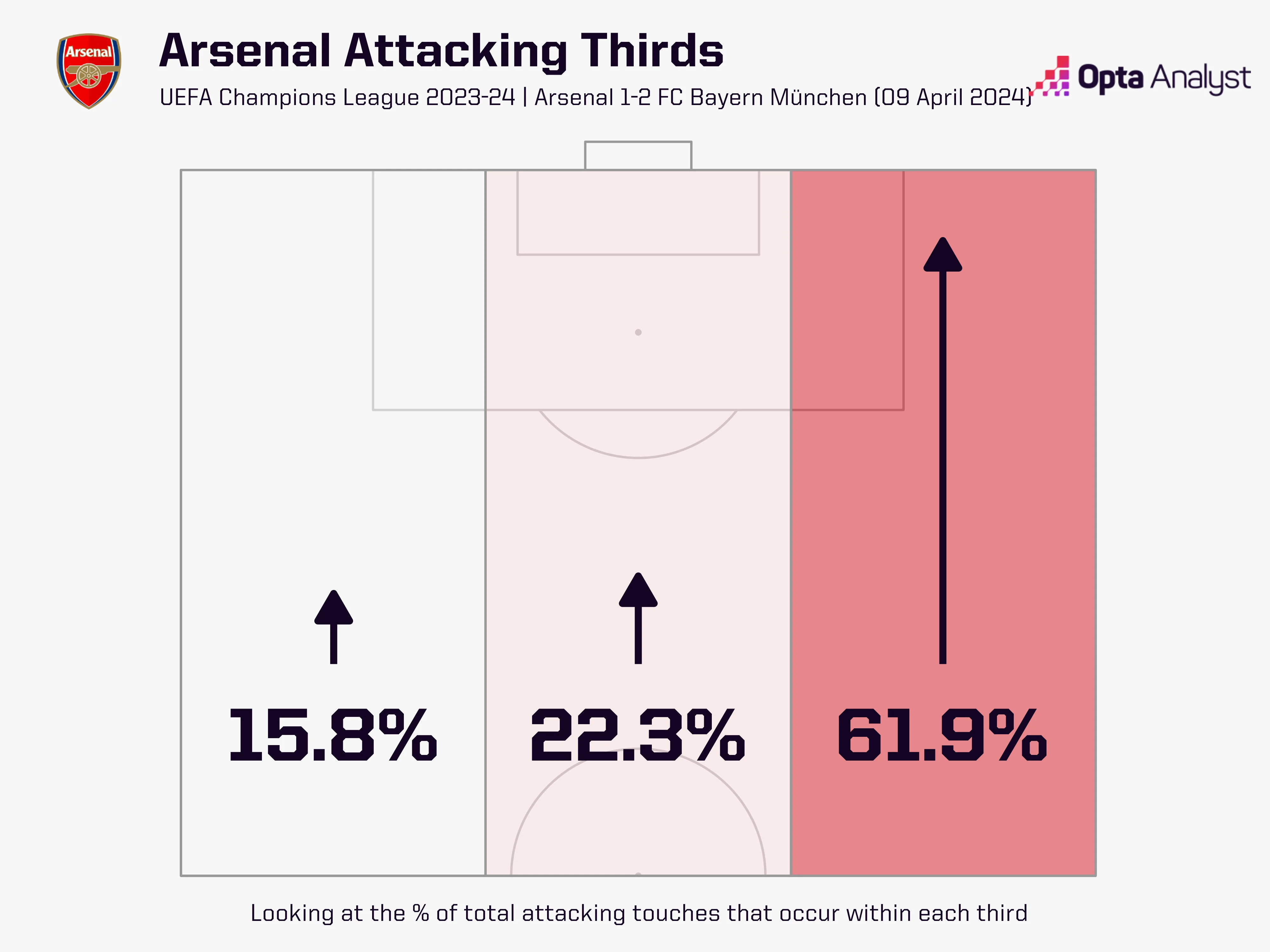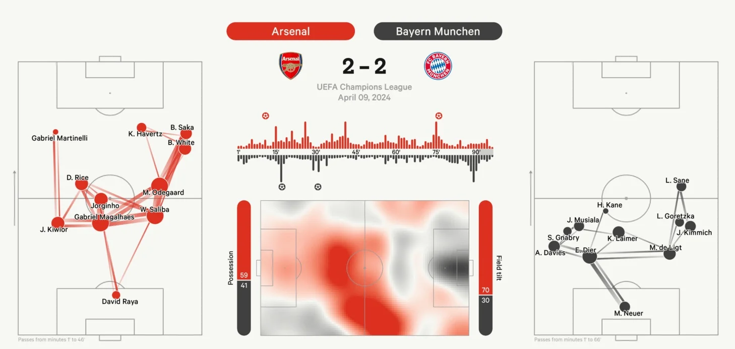Мюнхенці ж приїхали контратакувати. У позиційному наступі вони взагалі нічого не запропонували, а від пресингу показово відмовились. Гнабрі і Кейн відкочувались у середній блок, надаючи свободу центрбек Арсенала – але перекриваючи канали передач на Жоржінью.