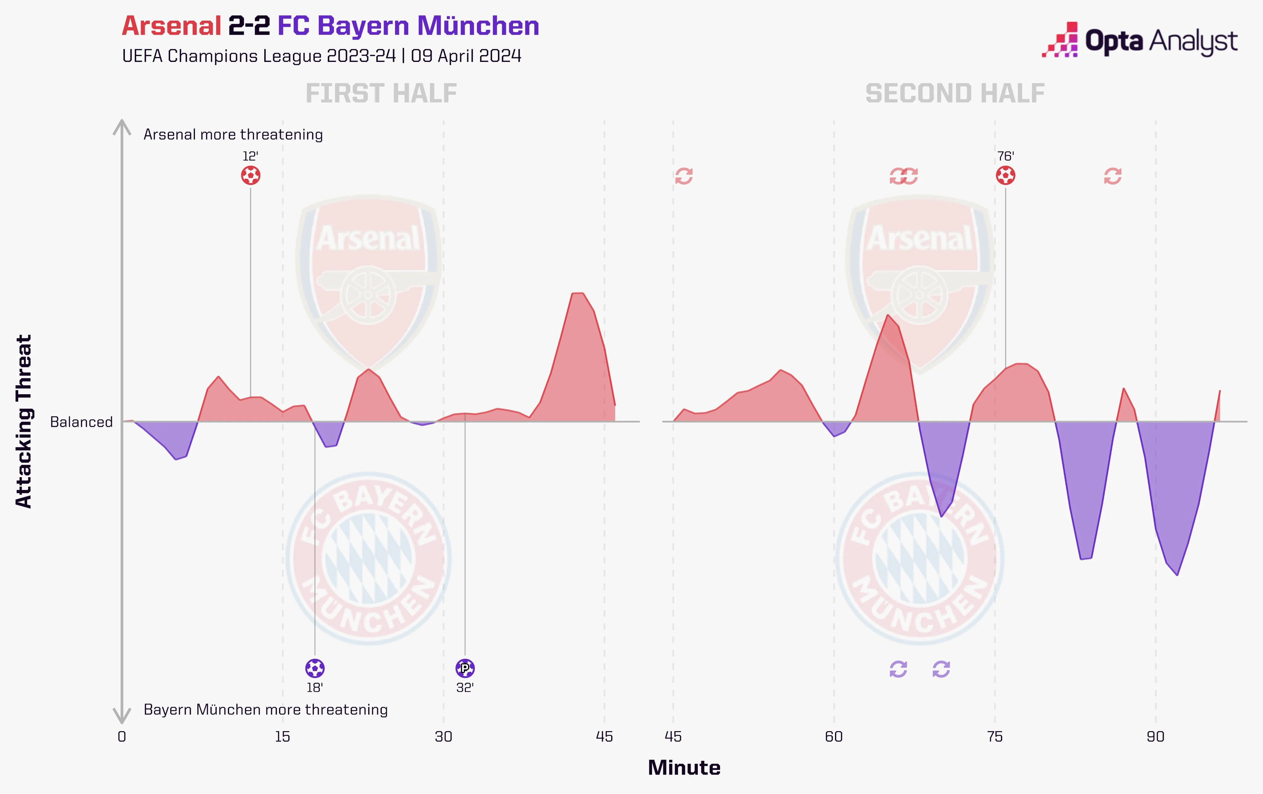 На практиці все вийшло складніше. Контролю в Арсеналу не стало більше – статистика по всіх показниках трималась у тих же пропорціях, що і до перерви. Малюнок гри загалом теж особливо не змінився. "Каноніри" тримали територіальну перевагу, а "рекордмайстер" відповідав контратаками. Причому по перерві Мюнхен суттєво покращив свою роботу по нічийних м'ячах.