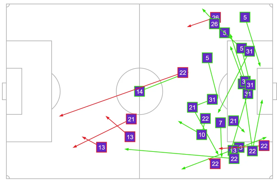 Втрати м'яча у 40-метровому радіусі від власних воріт (зірочки – втрати, що завершились ударами)