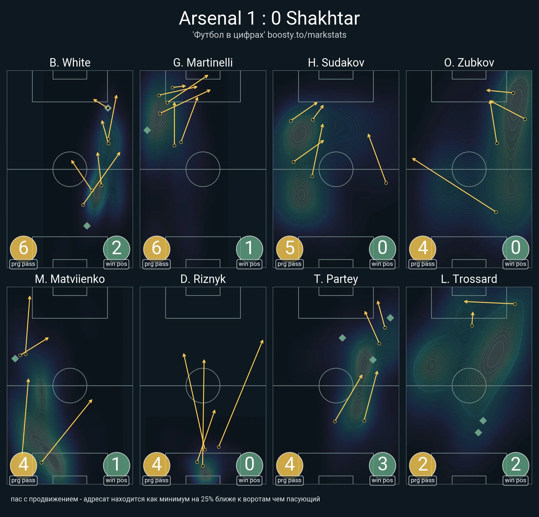 У другому таймі Шахтар теж виглядав симпатично. Що і говорити – команда лідирувала за ударами (7:5), тримала м'яч 54% ігрового часу, провела більше пасів (244 проти 209) при ідентичній точності в 89%. І якщо до перерви дві третини пасів "гірники" віддали на власній половині поля (при колосальній перевазі "канонірів" у цій метриці), то в другому донеччани лідирували зі 112 передачами за центральним колом (проти 90 в суперника).