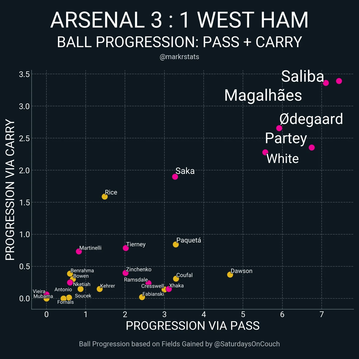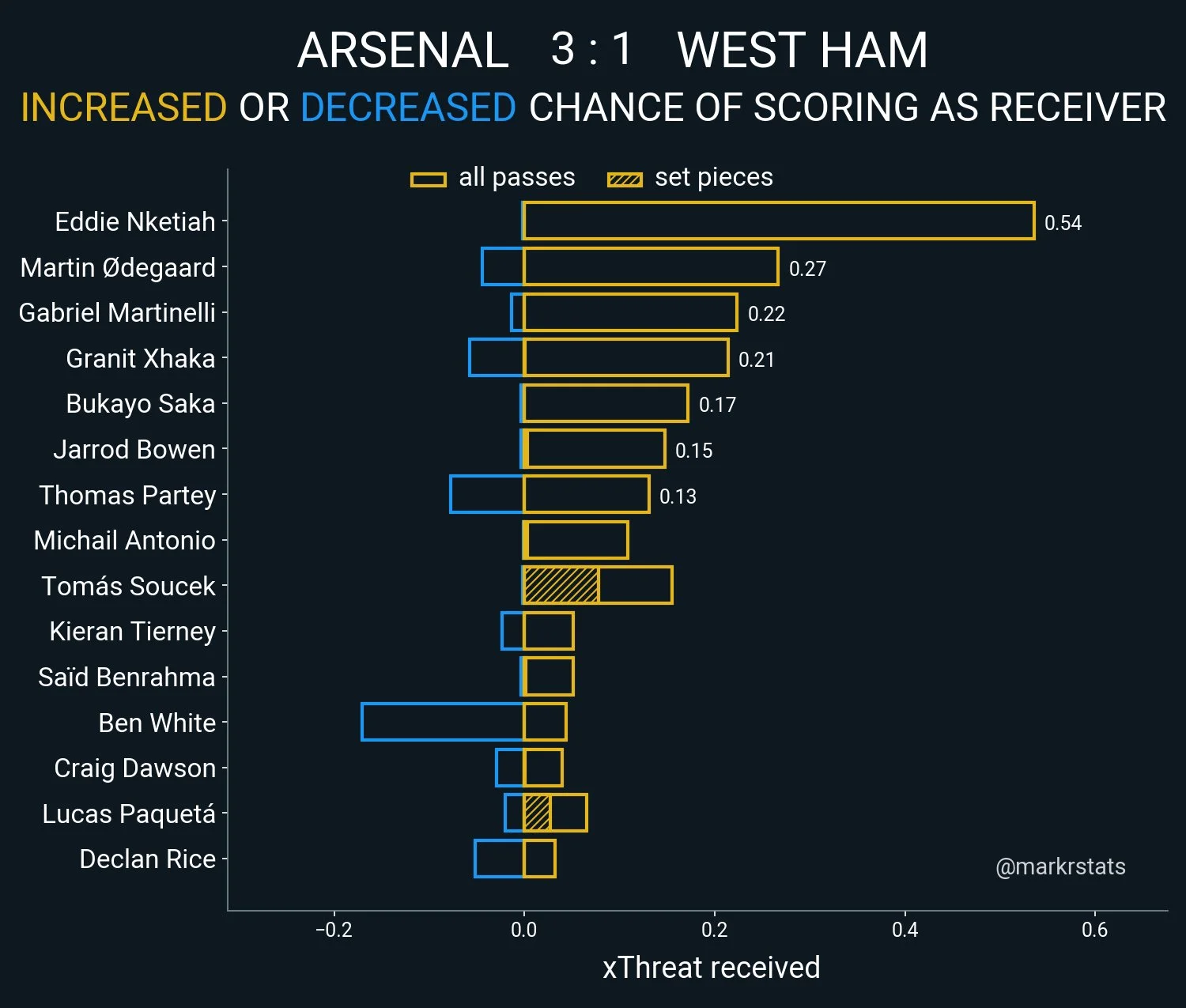 Габріел в принципі не є топ-дриблером Арсенала, в середньому виконуючи 6,09 обіграшів з 53,3% успішності. Матч з Вест Хемом це довів. Втім, це зовсім не значить, що Мартінеллі не є вкрай небезпечним.