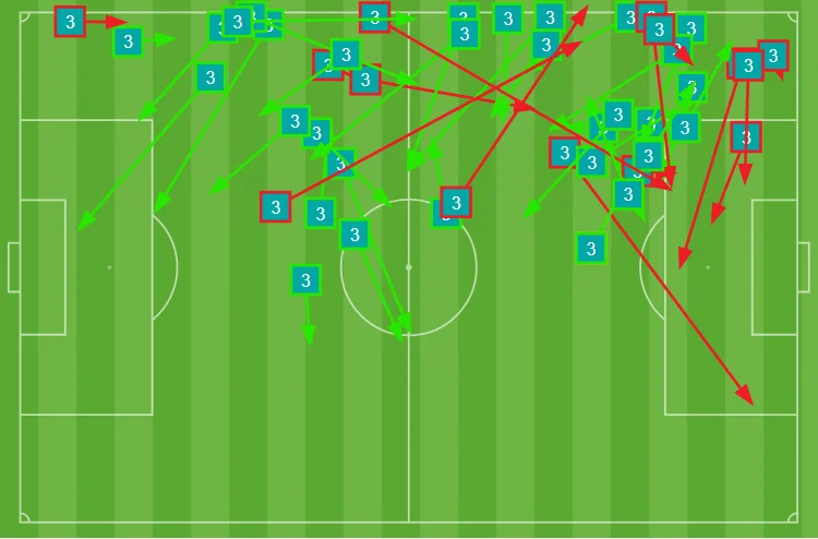 Карта передач яскраво демонструє, чому Тірні не замінить Зінченка у ролі інвертованого фулбека на постійній основі. Олександр покриває значно більший простір, активніше працюючи на контроль і просування м’яча.
