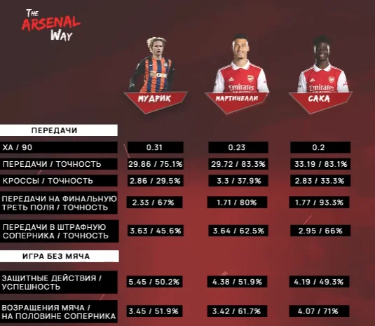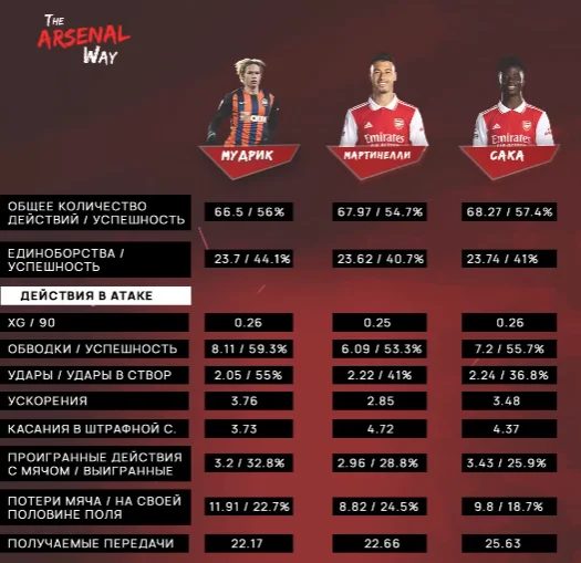 Взагалі, якщо відкрити статистику Wyscout, то можна помітити схожість майже всіх статистичних даних Мудрика й Мартінеллі. У Габріеля кращий пресинг, браку при роботі з м’ячем трішки менше, а дотиків у штрафному дещо більше – але перевага не є критичною навіть з урахуванням різниці в рівні спротиву.