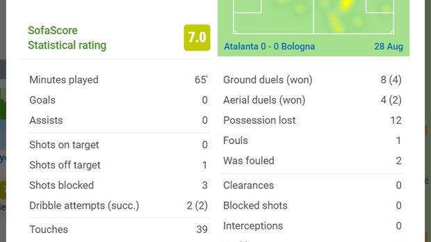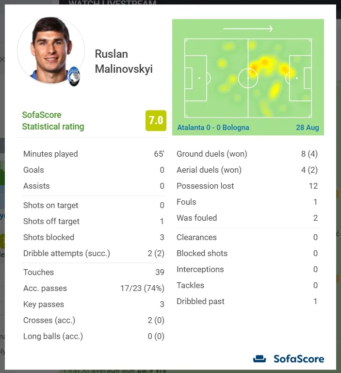 Зрештою Маліновський продуктивно провів свої 65 хвилин. Його оцінка від статистичних порталів – одна з найвищих у команді. Хоча Аталанта сьогодні діяла настільки яскраво, що ніхто відверто не провалився. Руслан став третім за показником xG (0,17) та найкращим за xA (0,13). Він намагався вести гру команди – лише три з його передач в атакувальній третині були спрямовані назад. В активі – три ключових паси. Поки у грі українця залишається чимало помилок. Точність передач сягнула лише 74%. Маліновський припустився аж 12 втрат володіння. Нівелювати це він старається грою на оборону. Три заблокованих удари, кілька відбирань на своїй половині, чимала кількість(12) єдиноборств – половина з них стали успішними.