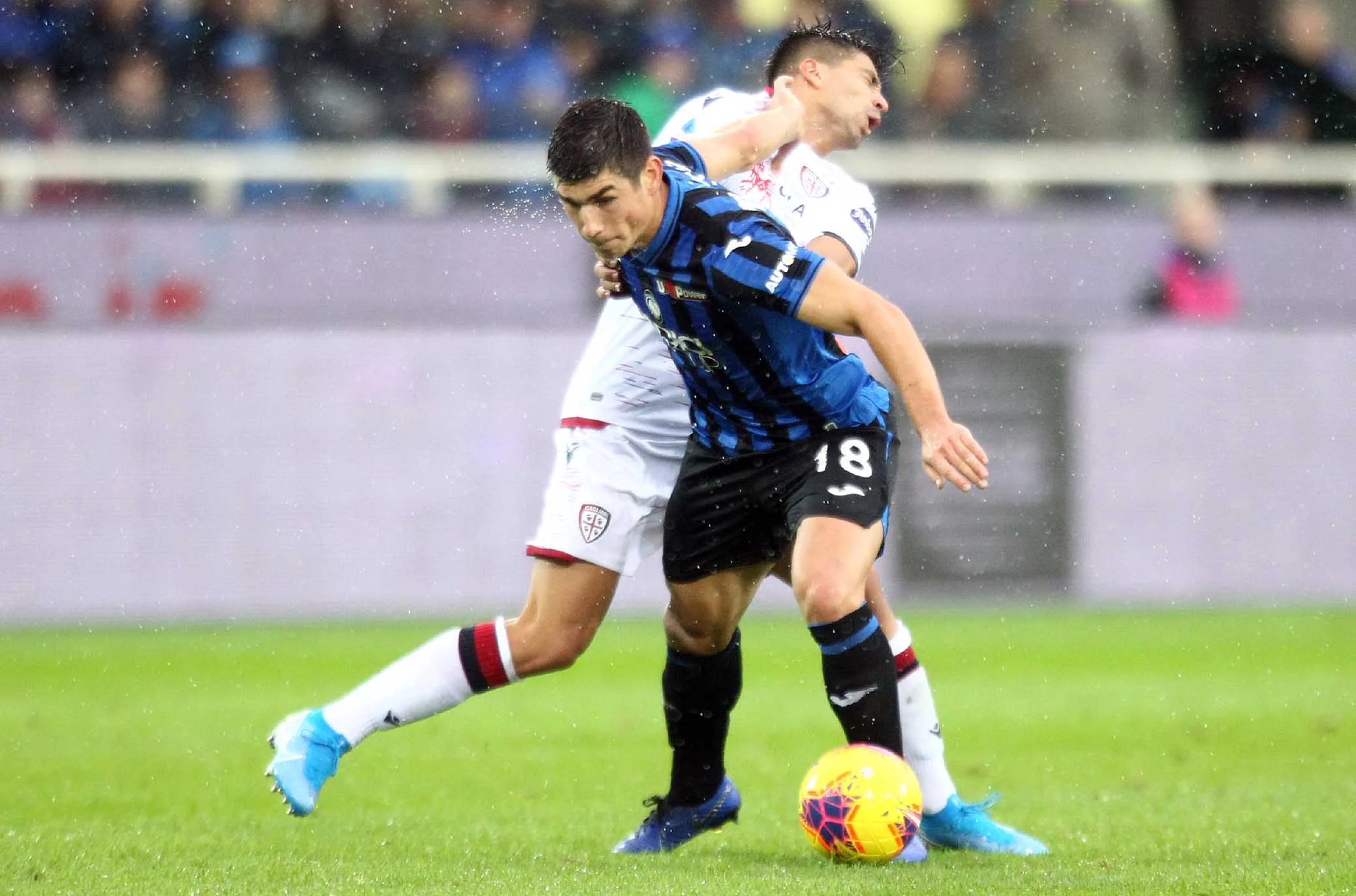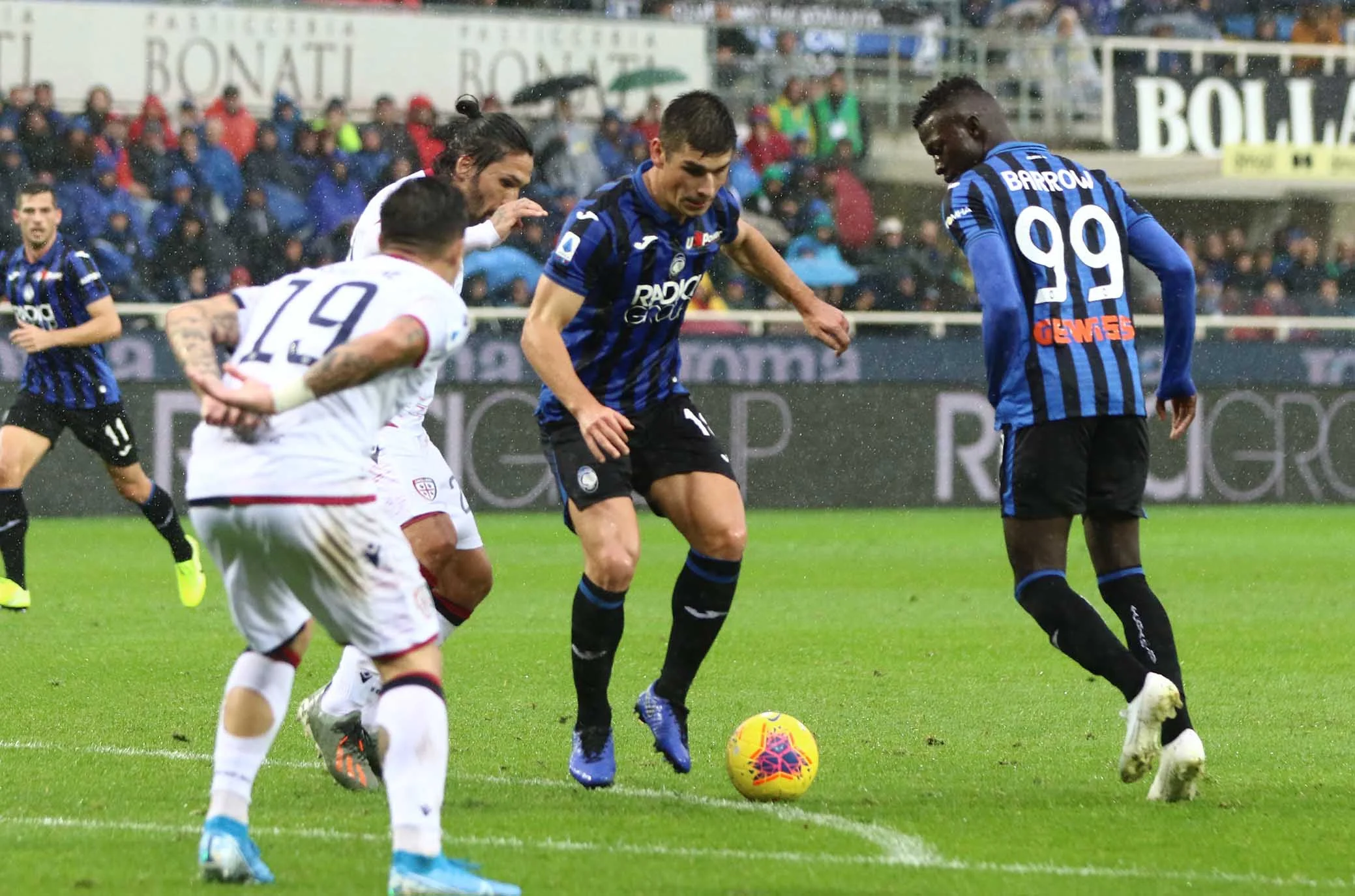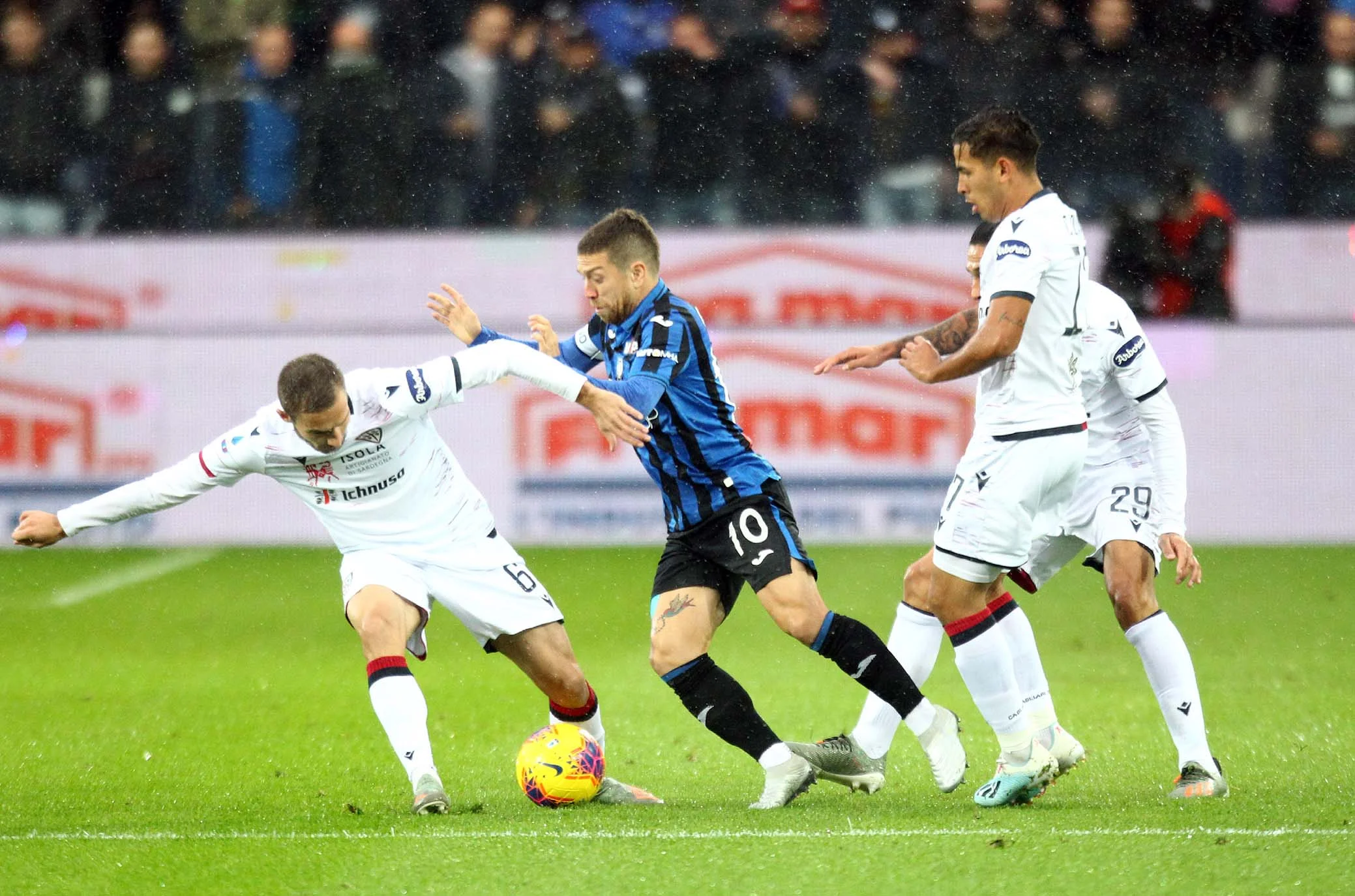 Під відчутним дощем почалася гра на Атлеті Адзуррі Д'Італія. Руслан Маліновський, якого популярні та профільні видання Італії прогнозували у стартовому складі, втретє поспіль опинився лише в запасі. Після помилки Мурієля Кальярі вибіг у швидку контру. Джованні Сімеоне, другий найкращий снайпер сардинців після Педро, міг відзначитися вже на 3-й хвилині, але програв дуель Голліні. Наінгголан здалеку пробив з рикошетом від спини захисника. Атака не завершилася, і після кутового гості дивом не замкнули скидання Сімеоне. Безпомічна Аталанта у перші 20 хвилин володіла м'ячем 56% часу, але за ударами поступалася 0:5.