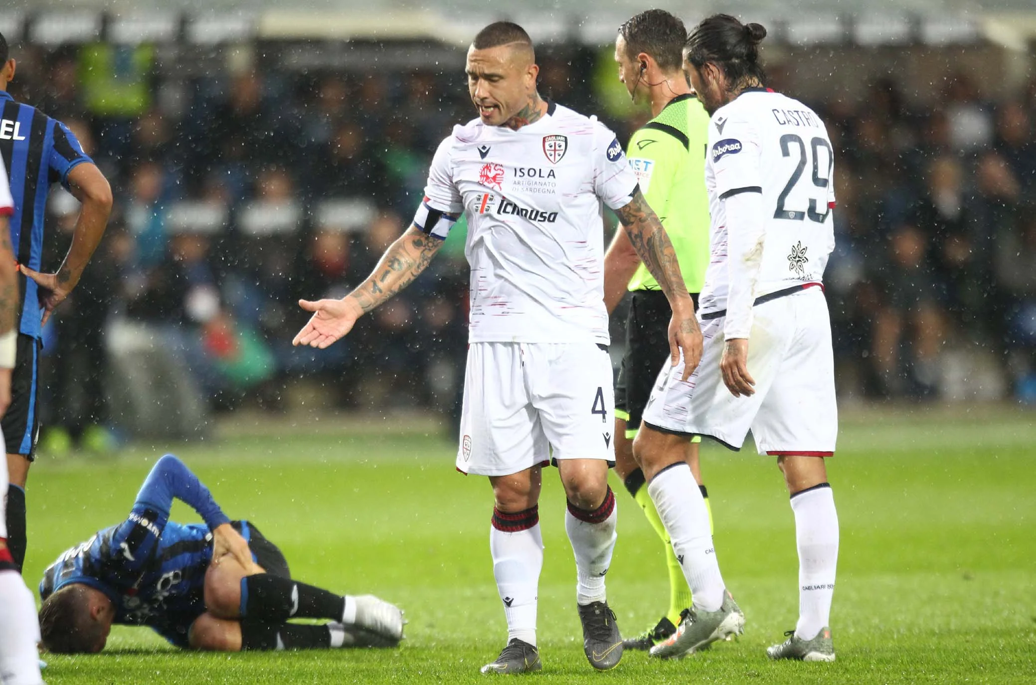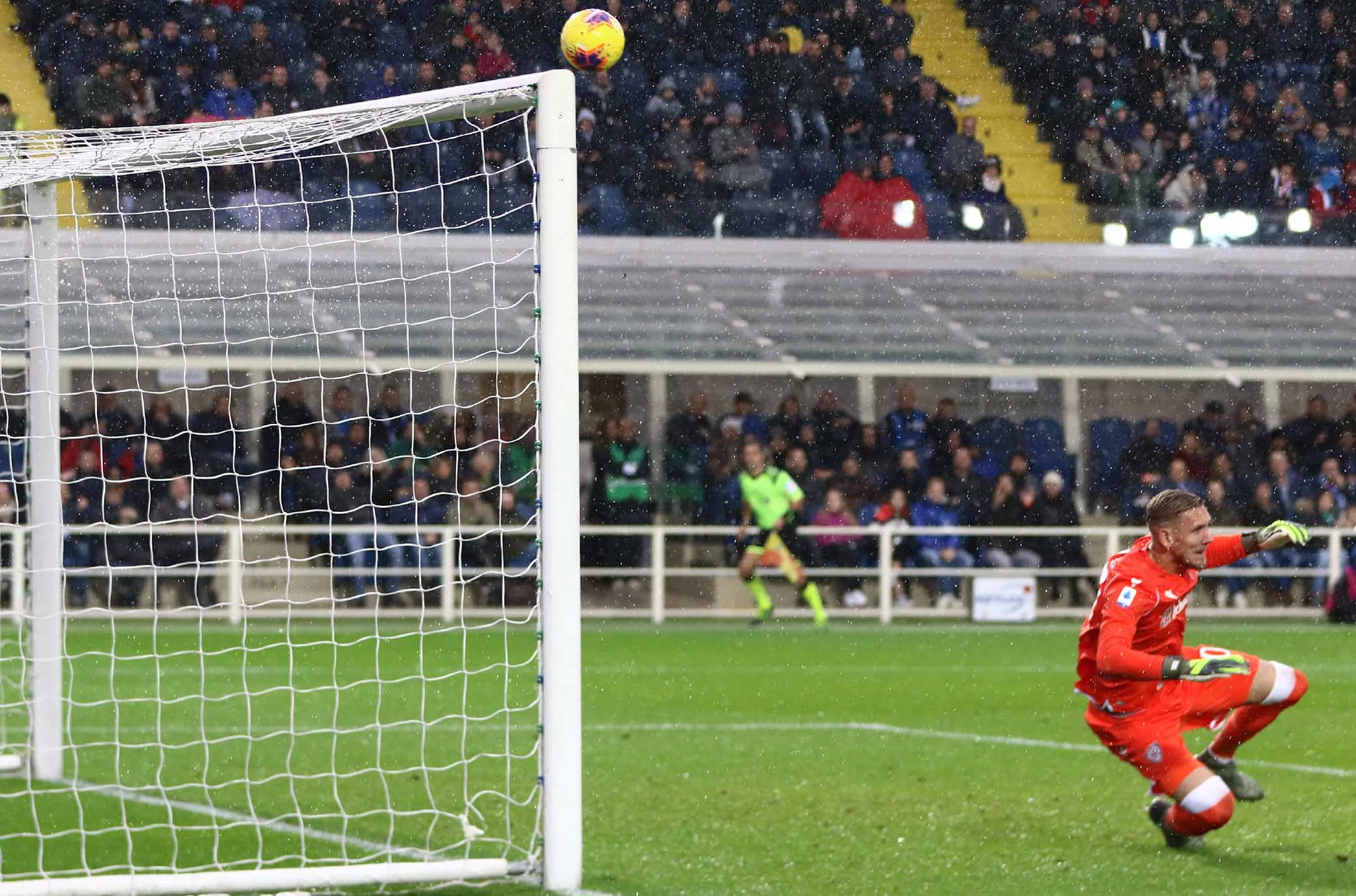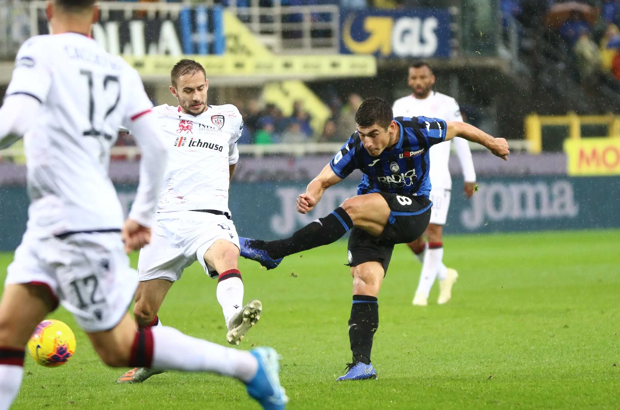 Під відчутним дощем почалася гра на Атлеті Адзуррі Д'Італія. Руслан Маліновський, якого популярні та профільні видання Італії прогнозували у стартовому складі, втретє поспіль опинився лише в запасі. Після помилки Мурієля Кальярі вибіг у швидку контру. Джованні Сімеоне, другий найкращий снайпер сардинців після Педро, міг відзначитися вже на 3-й хвилині, але програв дуель Голліні. Наінгголан здалеку пробив з рикошетом від спини захисника. Атака не завершилася, і після кутового гості дивом не замкнули скидання Сімеоне. Безпомічна Аталанта у перші 20 хвилин володіла м'ячем 56% часу, але за ударами поступалася 0:5.