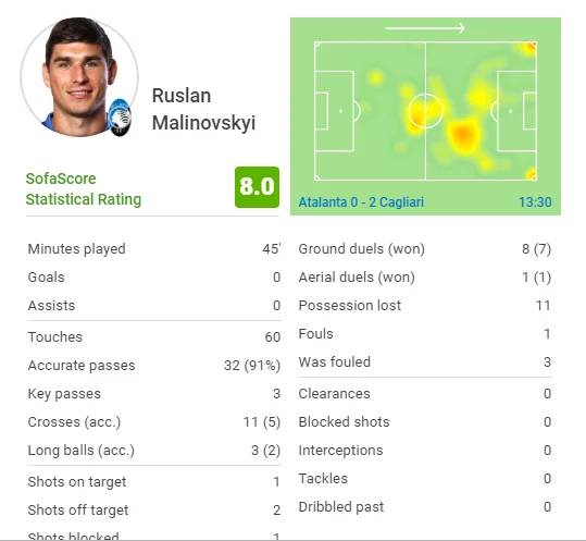 Практично кожна атака йде через Руслана. Не вистачає останнього удару. Кальярі виходить в атаку 3 на 1, але Голліні рятує після удару впритул. Провальний пас півзахисника збірної України – уже друга поспіль невдала дія. Перша привела до тої самої контратаки сардинців. Не вистачає креативу Гомеса. Доводиться брати дальніми ударами. Маліновський класно пробив майже в дев'ятку, але Ольсен потягнув. Після кутового знову нема кому проштовхнути м'яч з меж воротарського. Маліновський став однозначним гравцем матчу в Аталанти за версією Sofascore (8,0) і Whoscored (7,41), але на фоні лідерів Кальярі не вразив. Команда Марана зрівнялася за очками з бергамасками.