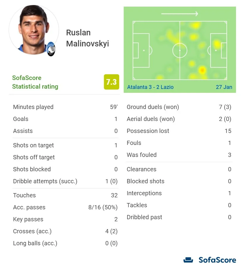 Гол подарував Маліні хорошу оцінку від статистичного порталу SofaScore – 7.3, одна з найкращих в команді.
