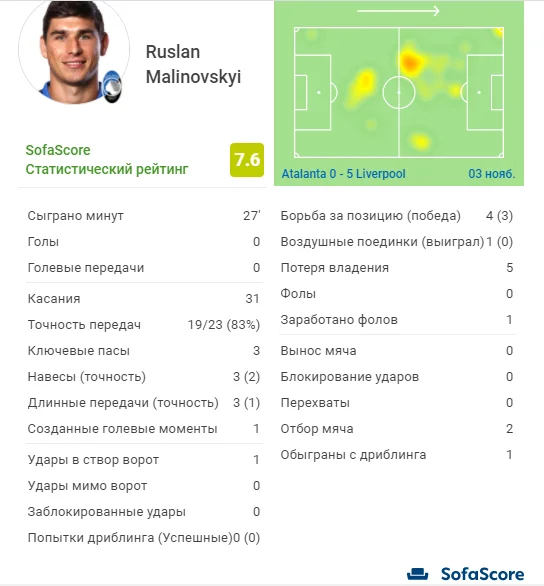 До честі Маліновського, навіть за таких трагічних обставин він зумів себе проявити і покращив гру команди. Завдав одного удару із середньої дистанції (в руки Аліссону), виконав розкішний черпачок на Ламмерса, вивів на вбивчу позицію Сапату, подавав кутові. Sofa Score визнали українця найкращим гравцем матчу у складі Аталанти – 7,6 балів. Схожої думки дотримуються і на Who Scored – 7 балів для Руслана. Стільки ж лише у Сапати.