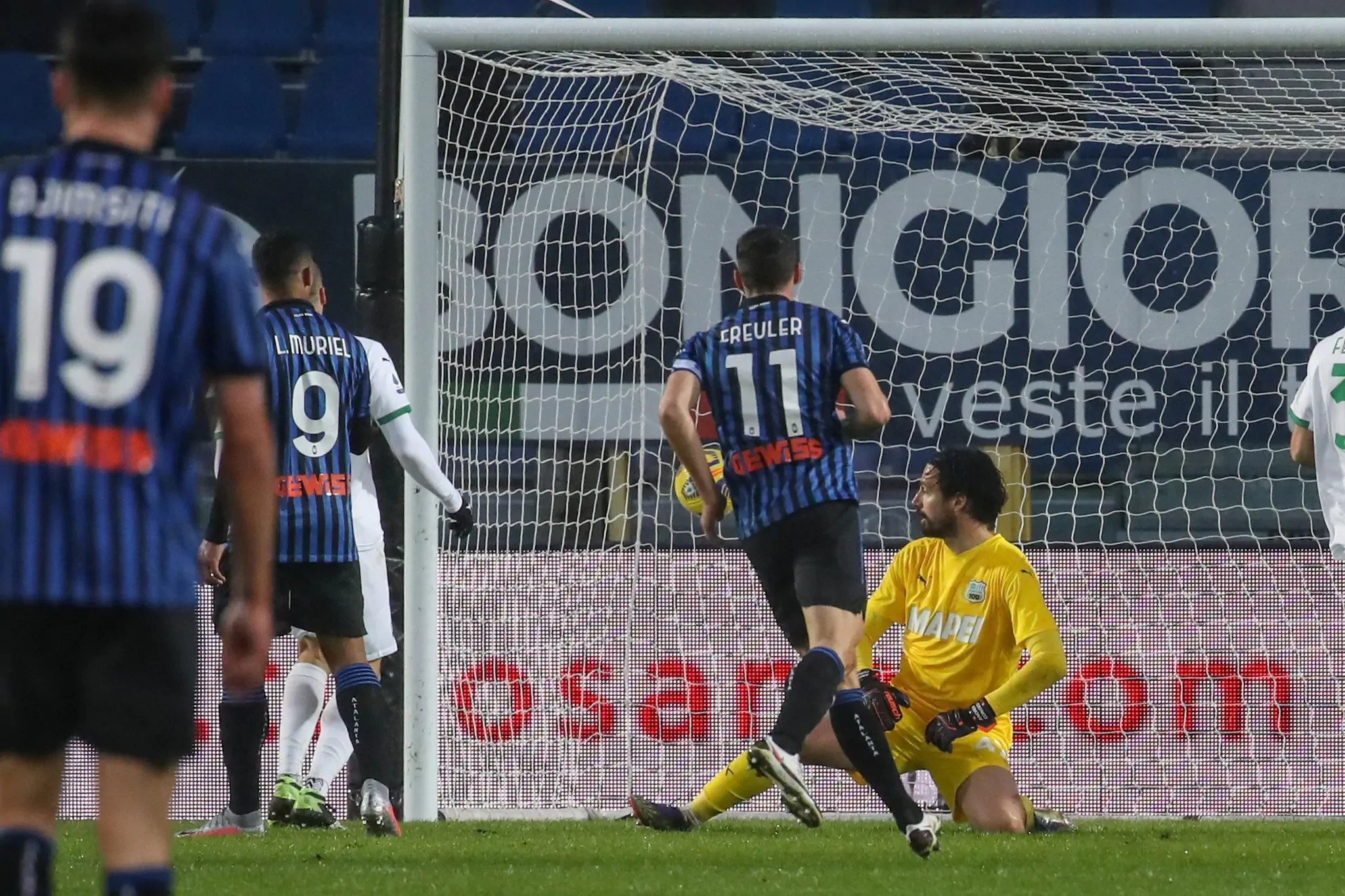 Голліні всього лише вибив снаряд у поле, а вийшов передгольовий пас голкіпера. Сапата виграв повітря, Госенс змістився у центр і потужно пробив – круглий відскочив від поперечини за лінію воріт. Маліновський і Мурієль виходять на 63 хвилині. Ілічіч і Пессіна сходять з поля. Український хавбек також активно увійшов у гру, сходу взявши безпосередню участь у парочці перспективних атак. Поки Руслан взяв паузу, його партнери з легкістю знищили захист Сассуоло. Сапата на Фройлера, той покотив у центр, Мурієль розстрілював з кількох метрів – 5:0 на 68-й.
