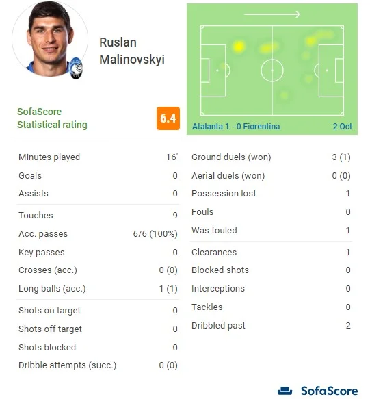 Класне відбирання Маліновського, є простір для контргри, проте далі Хойлунд не відчув пас Руслана. Українець видав 100-відсоткову точність передач, тричі повертав володіння команді, не без проблем довівши справу до перемоги. Також підстрахував партнерів виносом м'яча, міг організувати 2 моменти з 9 дотиків до м'яча, однак на іншому полюсі 2 програні єдиноборства з 3. Крім цього, двічі дозволив себе пройти на дриблінгу. Зрештою, Аталанта набирає 20 очок, а це стільки ж, як у Наполі, який очолює таблицю завдяки кращим додатковим показникам. Фіорентина осідає на 11 місці, залишаючись з 9 балами.