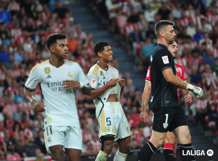 Ймовірно, ідея полягала у створенні певного хаосу на третині поля Атлетіка. Беллінгем у своєму фірмовому стилі мав стати диспетчером атак "бланкос", розганяючи їх розрізними пасами й ривками з глибини. Втім, даній моделі бракувало зіграності – біля чужого штрафного не вистачало якісних відкривань, а домінування на м'ячі довгий час не перетворювалось у моменти. До 20-ї хвилини вболівальники побачили лишень один удар метрів з 30-ти (по горобцях).