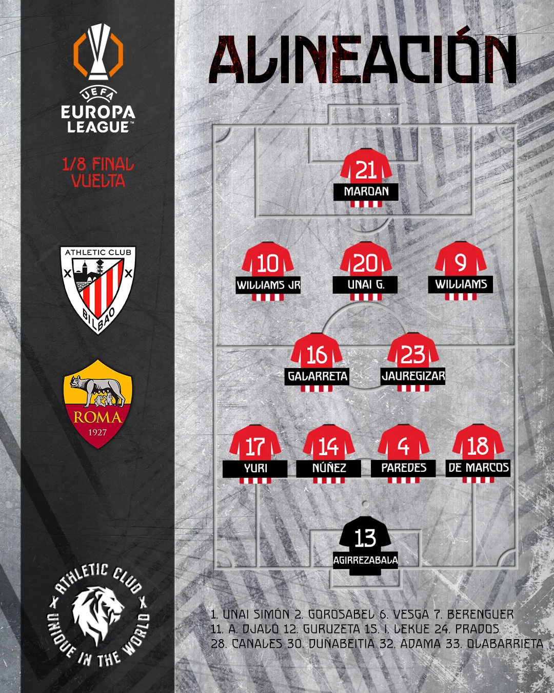 Атлетік: Агіррезабала – Де Маркос (к), Нуньєс, А. Паредес, Берчіче – де Галларета, Хаурегізар – Іньякі Вільямс, Унай Гомес, Ніко Вільямс – Мароан Саннаді