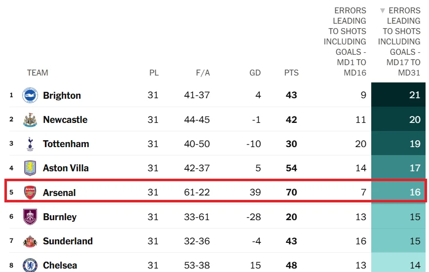 Можливо, цей матч стане демонстрацією мистецтва оборони? Тут теж є нюанси. Протягом перших 16 матчів АПЛ Арсенал припустився всього 7 помилок, які призвели до удару (менше провалювався тільки Лідс). Втім, у наступних 15 турах сталося ще 16 подібних помилок – це вже рівень п'ятої з кінця оборони Англії. Нині кількість помилок перевалила за 20.