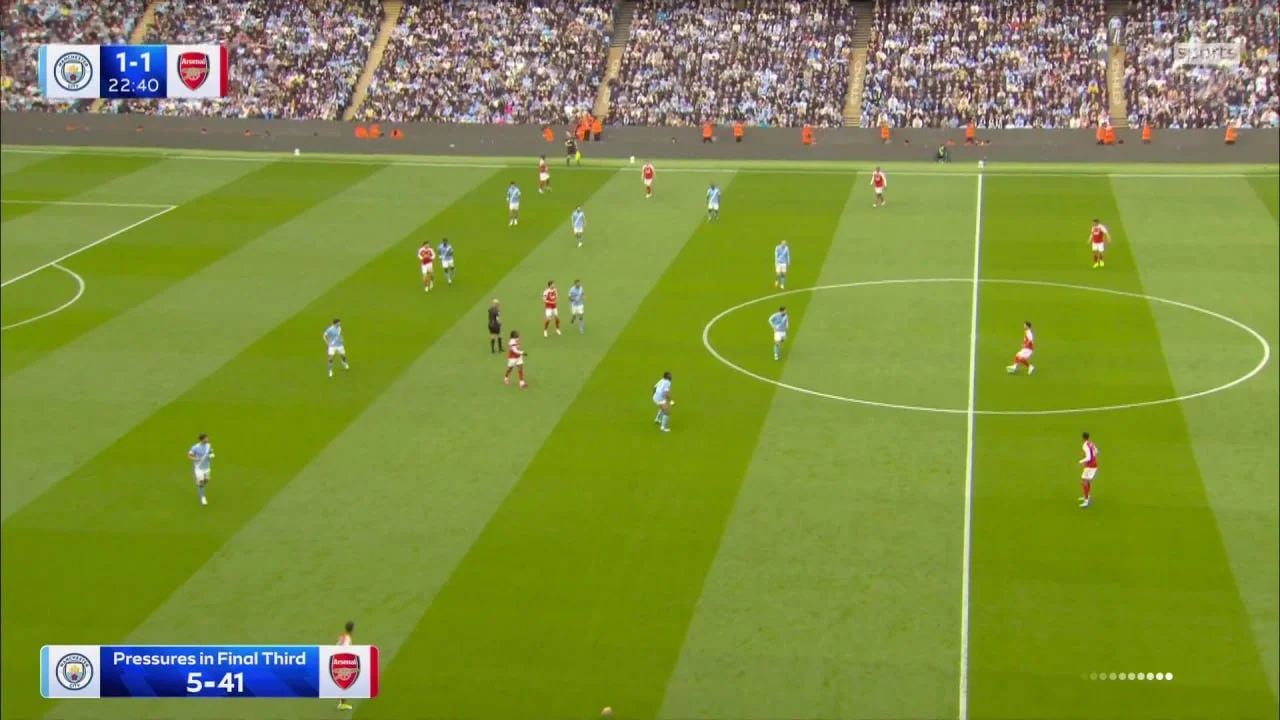 По-друге, "гармаші" досі залишаються ідеальними в плані пресингу й контрпресингу. Навіть Манчестер Сіті вдалося шокувати – всього за 20 стартових хвилин лондонці провели 40 пресинг-дій на чужій третині й забили гол із високого тиску. Чужих центрбеків пресингував навіть Габріел.