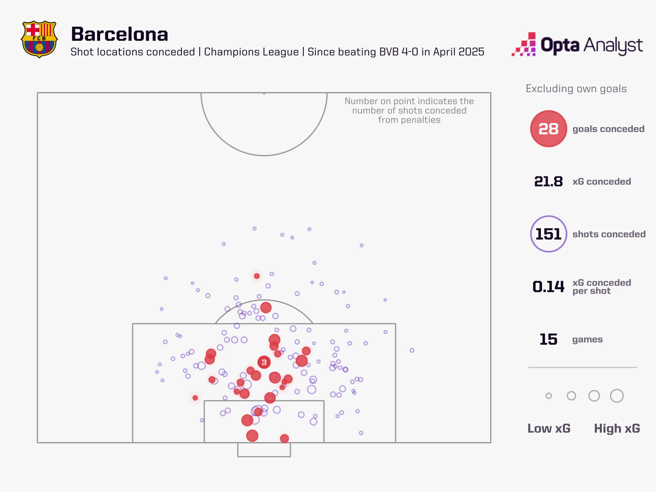 Барселона стала першою іспанською командою, якій забивали в 15 матчах ЛЧ поспіль. Останній "сухар" трапився у квітні 2025-го, в поєдинку проти Дортмунда. Цікаво, що на цьому відрізку команда ковтнула на 6,2 голів більше, ніж очікувалось. Крім того, каталонці пропустили 44-й гол у ЛЧ з моменту призначення Хансі Фліка – жоден клуб не пропускав стільки.