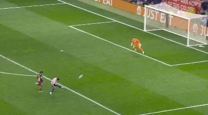 Цей гол явно вибив Барсу з колії. Останні 15-хвилинка першого тайму пройшла на рівних. За цей час каталонці створили всього один момент – це Торрес виходив сам на сам з передачі Ямаля, але Муссо знову зіграв прекрасно. Своєчасний вихід дозволив скоротити дистанцію й накрити удар.