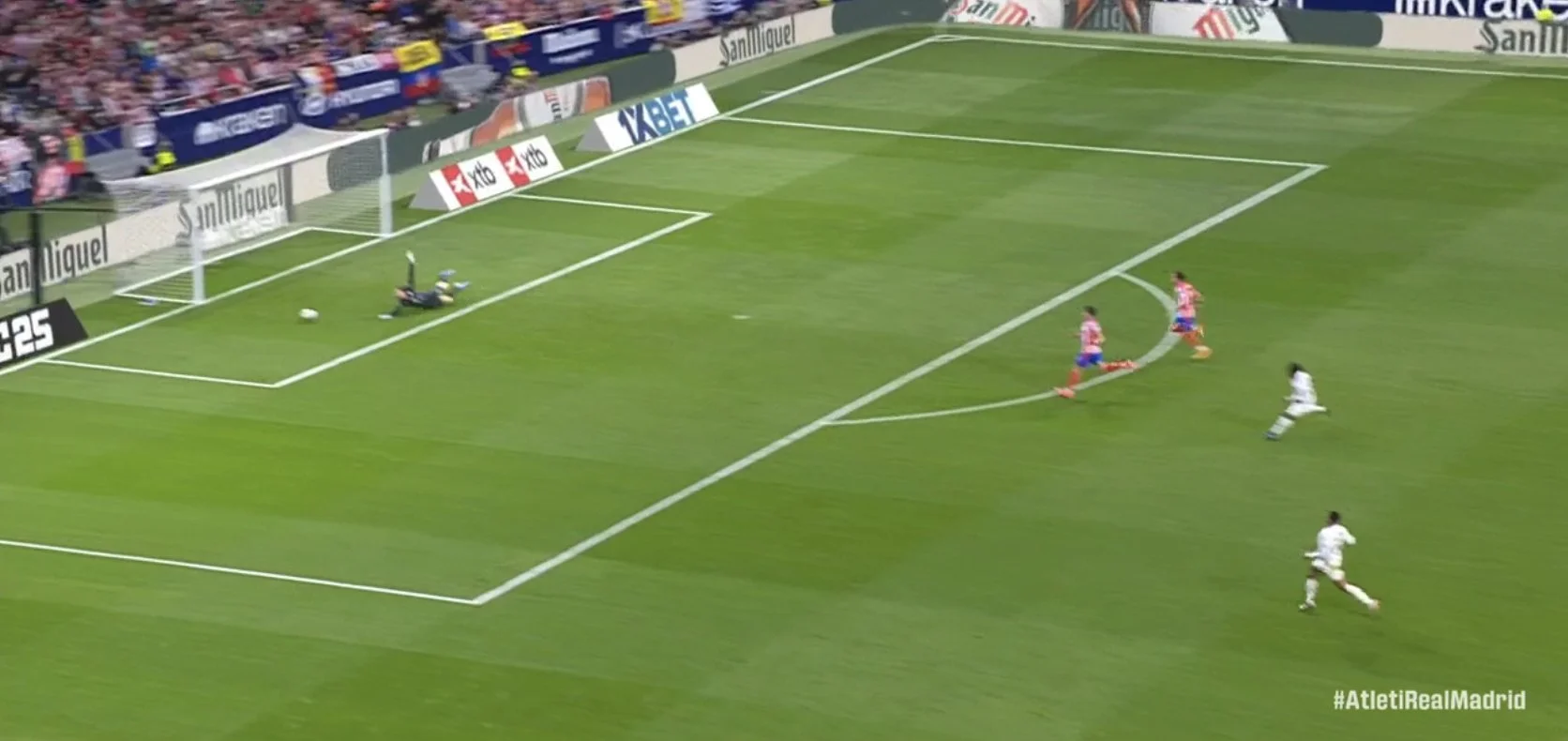 А от Атлетіко після відновлення гри Атлетіко довго не міг намацати свій футбол. Гості могли скористатись цим на 73-й та 89-й хвилинах. У першому випадку Вінісіус змістився з лівого флангу на півколо та зарядив у дальній нижній (Облак парирував)...
