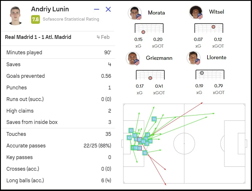 Хоча для Луніна матч навряд чи здавався нудним. Так, Атлетіко провів всього 8 ударів, однак майже кожен становив небезпеку. Вступати у гру українцю довелося вже на 8-й хвилині, коли Начо проґавив ривок Морати у штрафний – Грізманн віддав проникний пас, а Альваро бахнув низом.