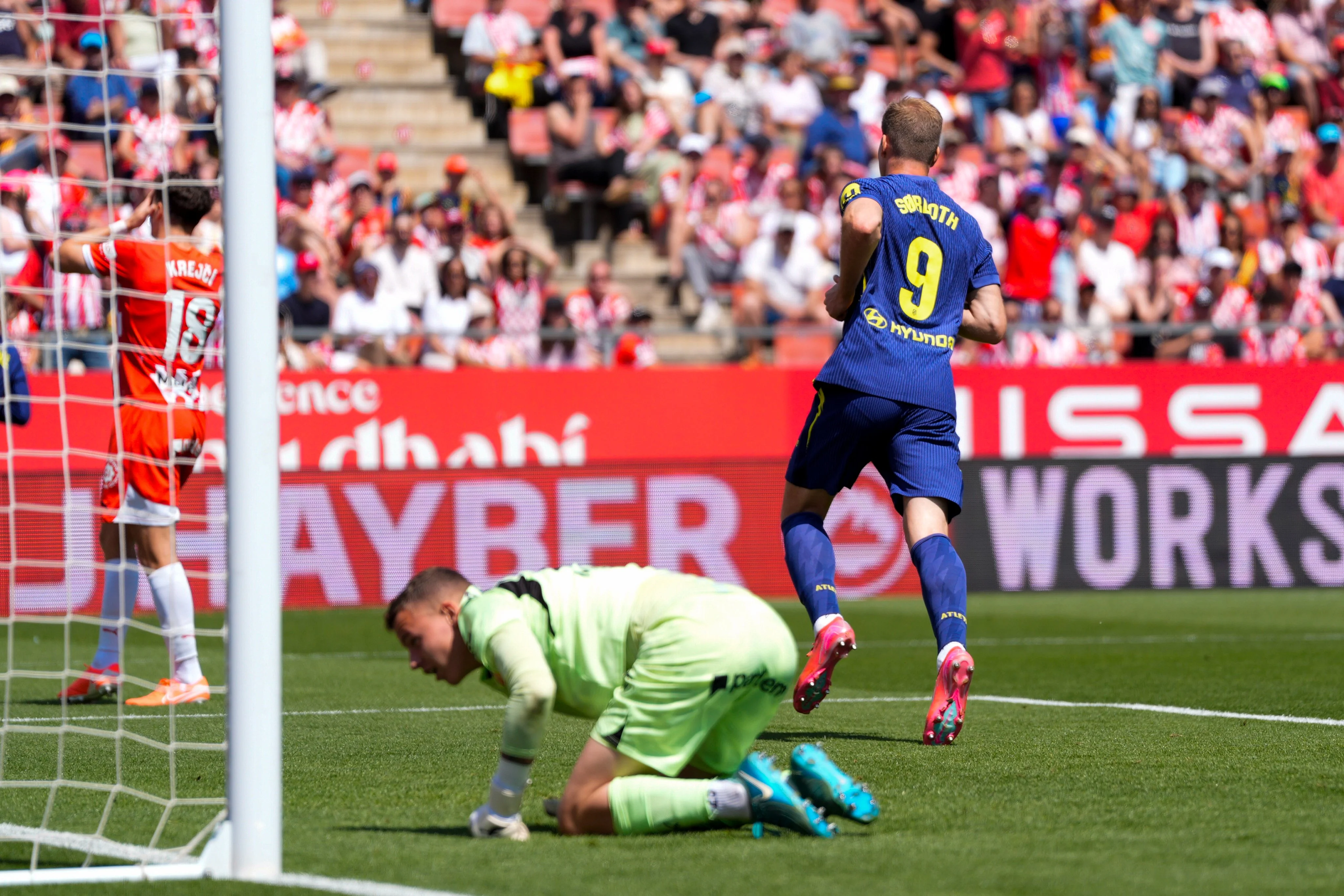В середині тайму Атлетіко вийшов вперед. Гравці Жирони втратили сферу на своїй половині поля, Альварес віддав передачу праворуч на Де Поля, той прострілив у центр на вільного Сьорлота і норвежець в дотик замкнув у сітку – Крапивцов у стрибку намагався завадити голу, але не дотягнувся до м'яча. Згодом Александер бив під поперечину з меж штрафного – Владислав зреагував.