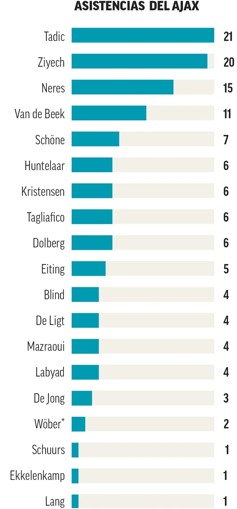Неймовірний технічний вишкіл усіх без виключення футболістів Аякса робить цю команду супернебезпечною на будь-якому клаптику поля. Практично кожен може не лише завершити атаку, але й віддати останній пас. У сезоні 2018/19 одразу 19 гравців основної обойми відзначались асистом. Лідери за цим показником – вже згаданий Тадіч (21), Зієш (20), Нерес (15) та ван де Беек (11). Шоне підносив "снаряди" 7 разів, а Хунтелаар, Крістенсен, Тальяфіко і Дольберг – по 6.