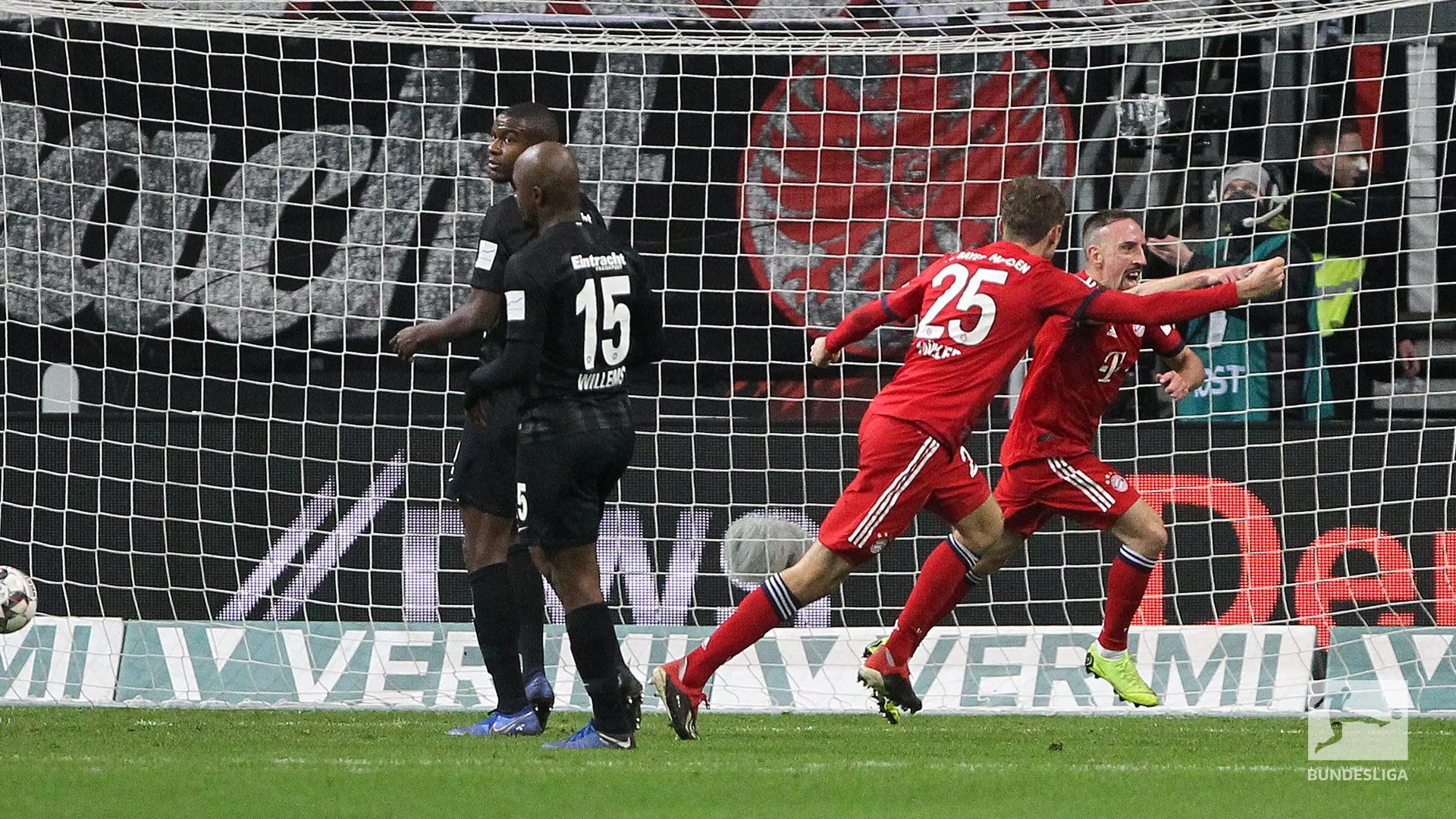 На 35-й хвилині мюнхенці проти логіки матчу вийшли вперед. Дальній пас з глибини змусив Ндіка помилитися, Мюллєр підхопив м'яч і підключив Лєвандовскі, а Роберт прокинув на 11-метрову позначку. На той момент оборона Айнтрахта не встигла перелаштуватися під епізод, з'явилися провали, тому ніхто не завадив Рібері відкрити рахунок.